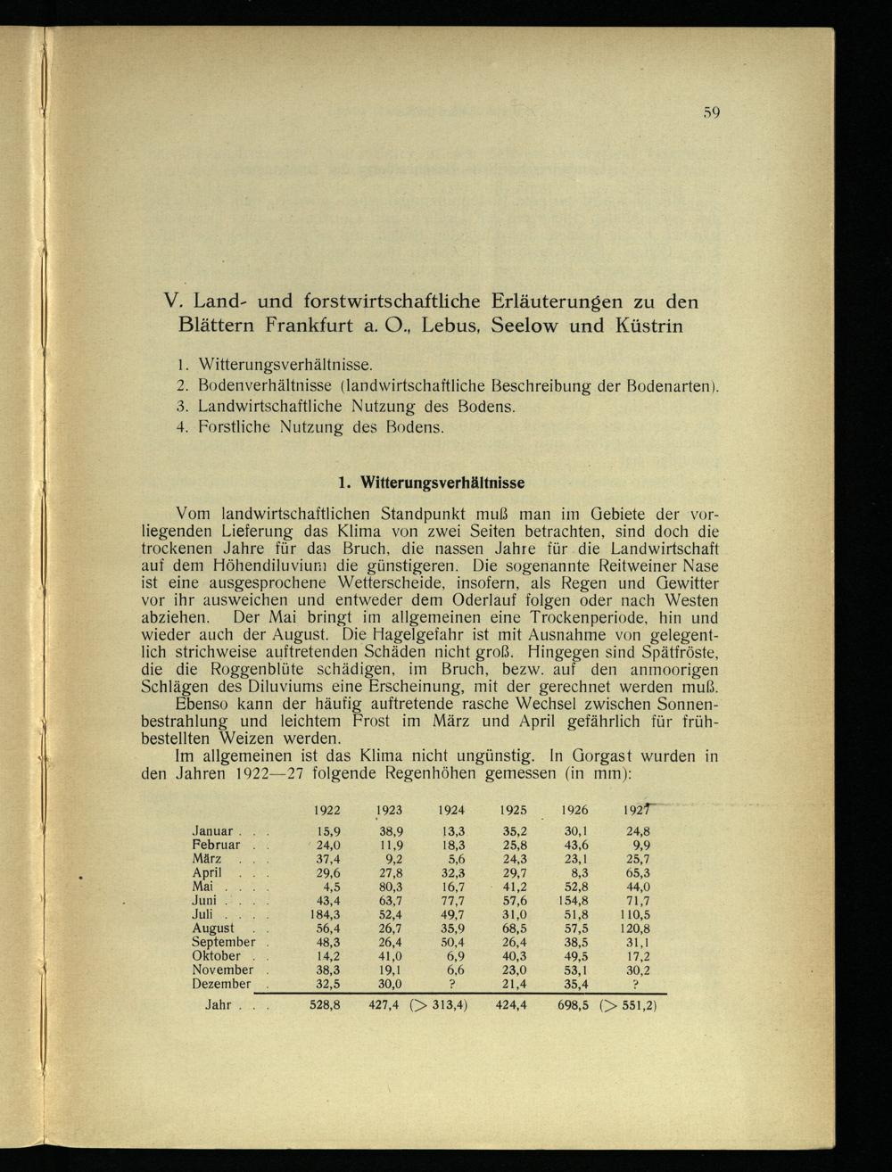 Vom landwirtschaftlichen Standpunkt muß man im Gebiete der vorliegenden Lieferung das Klima von zwei Seiten betrachten, sind doch die trockenen Jahre für das Bruch, die nassen Jahre für. die Landwirtschaft auf dem Höhendiluvium die günstigeren. Die sogenannte Reitweiner Nase ist eine ausgesprochene Wetterscheide, insofern, als Regen und Gewitter vor ihr ausweichen und entweder dem Oderlauf folgen oder nach Westen abziehen. Der Mai bringt im allgemeinen eine Trockenperiode, hin und wieder auch der August. Die Hagelgefahr ist mit Ausnahme von gelegentlich strichweise auftretenden Schäden nicht groß. Hingegen sind Spätfröste, die die Roggenblüte schädigen, im Bruch, bezw. auf den anmoorigen Schlägen des Diluviums eine Erscheinung, mit der gerechnet werden muß.