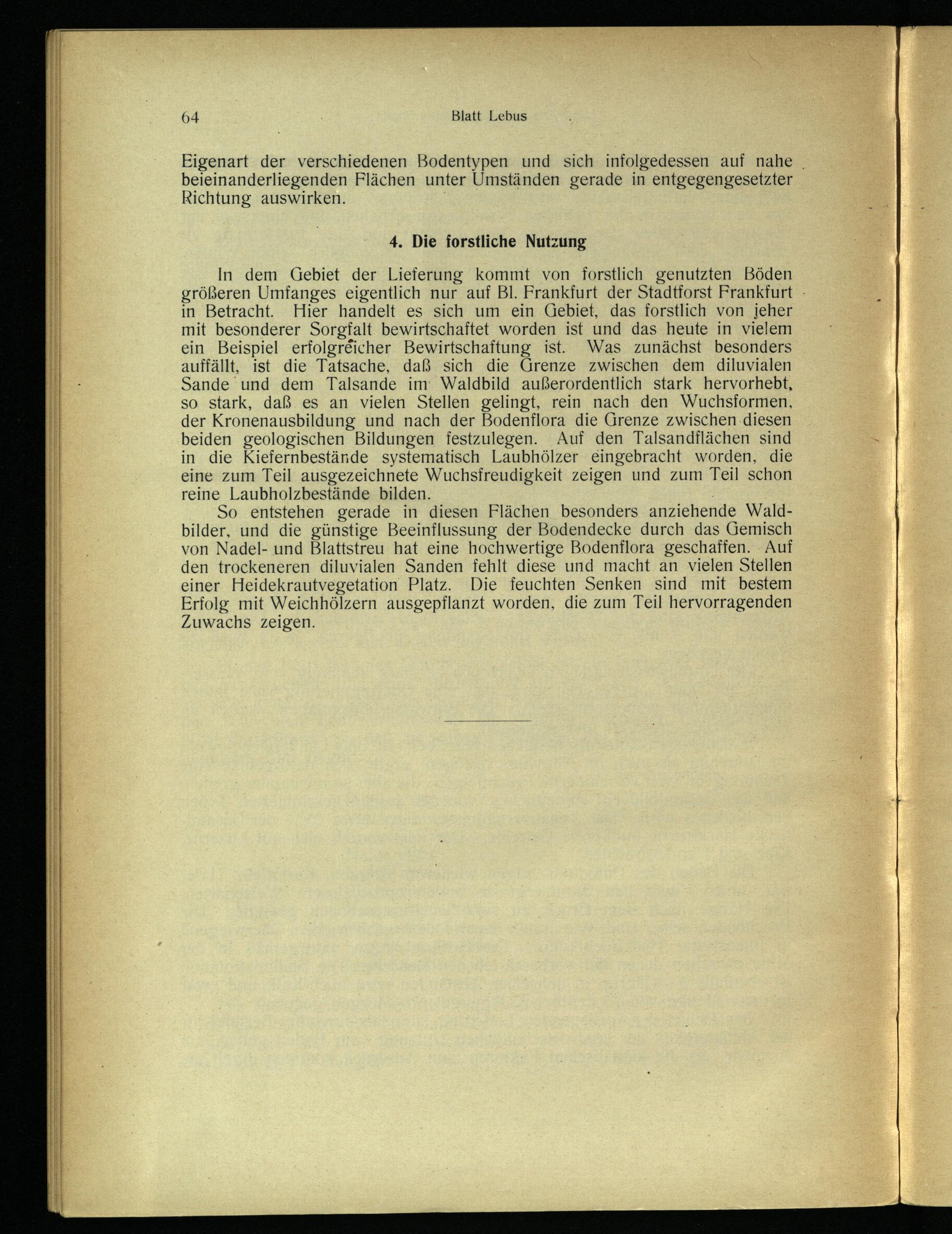 In dem Gebiet der Lieferung kommt von forstlich genutzten Böden größeren Umfanges eigentlich nur auf Bl. Frankfurt der Stadtforst Frankfurt in Betracht. Hier handelt es sich um ein Gebiet, das forstlich von jeher mit besonderer Sorgfalt bewirtschaftet worden ist und das heute in vielem ein Beispiel erfolgreicher Bewirtschaftung ist. Was zunächst besonders auffällt, ist die Tatsache, daß sich die Grenze zwischen dem diluvialen Sande und dem Talsande im Waldbild außerordentlich stark hervorhebt, so stark, daß es an vielen Stellen gelingt, rein nach den Wuchsformen, der Kronenausbildung und nach der Bodenflora die Grenze zwischen. diesen beiden geologischen Bildungen festzulegen. Auf den Talsandflächen sind in die Kiefernbestände systematisch Laubhölzer eingebracht worden, die eine zum Teil ausgezeichnete Wuchsfreudigkeit zeigen und zum Teil schon reine Laubholzbestände bilden.