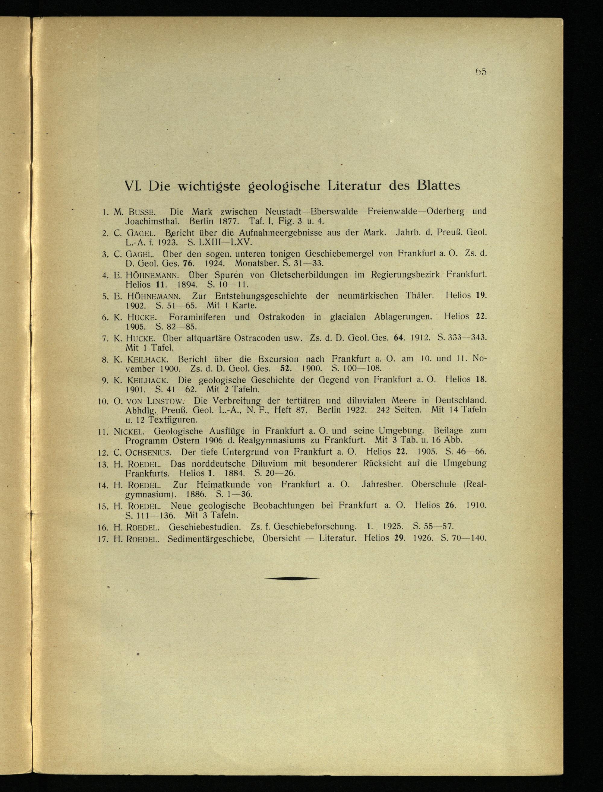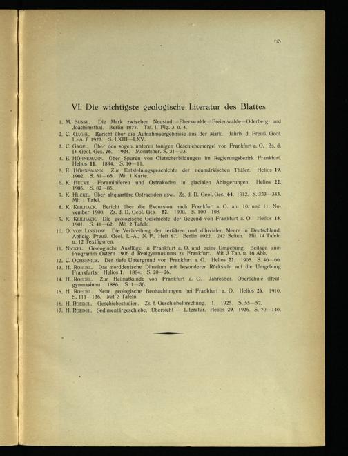 11. NICKEL. Geologische Ausflüge in Frankfurt a. O. und seine Umgebung. Beilage zum Programm Ostern 1906 d. Realgymnasiums zu Frankfurt . Mit 3 Tab. u. 16 Abb. 12. C. OCHSENIUS. Der tiefe Untergrund von Frankfurt a. O. Helios 22. 1905. S. 46-66. 13. H. ROEDEL. Das norddeutsche Diluvium mit besonderer Rücksicht auf die Umgebung Frankfurts . Helios 1. 1884. S. 20-26. 14. H. ROEDEL. Zur Heimatkunde von Frankfurt a. O. Jahresber. Oberschule( Realgymnasium). 1886. S. 1-36.