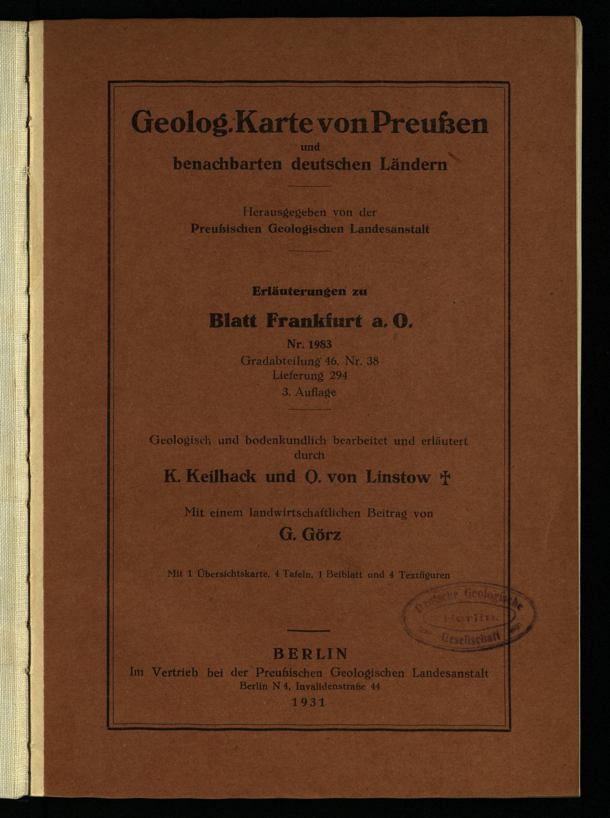 Im Vertrieb bei der Preußischen Geologischen Landesanstalt Berlin N 4, Invalidenstraße 44