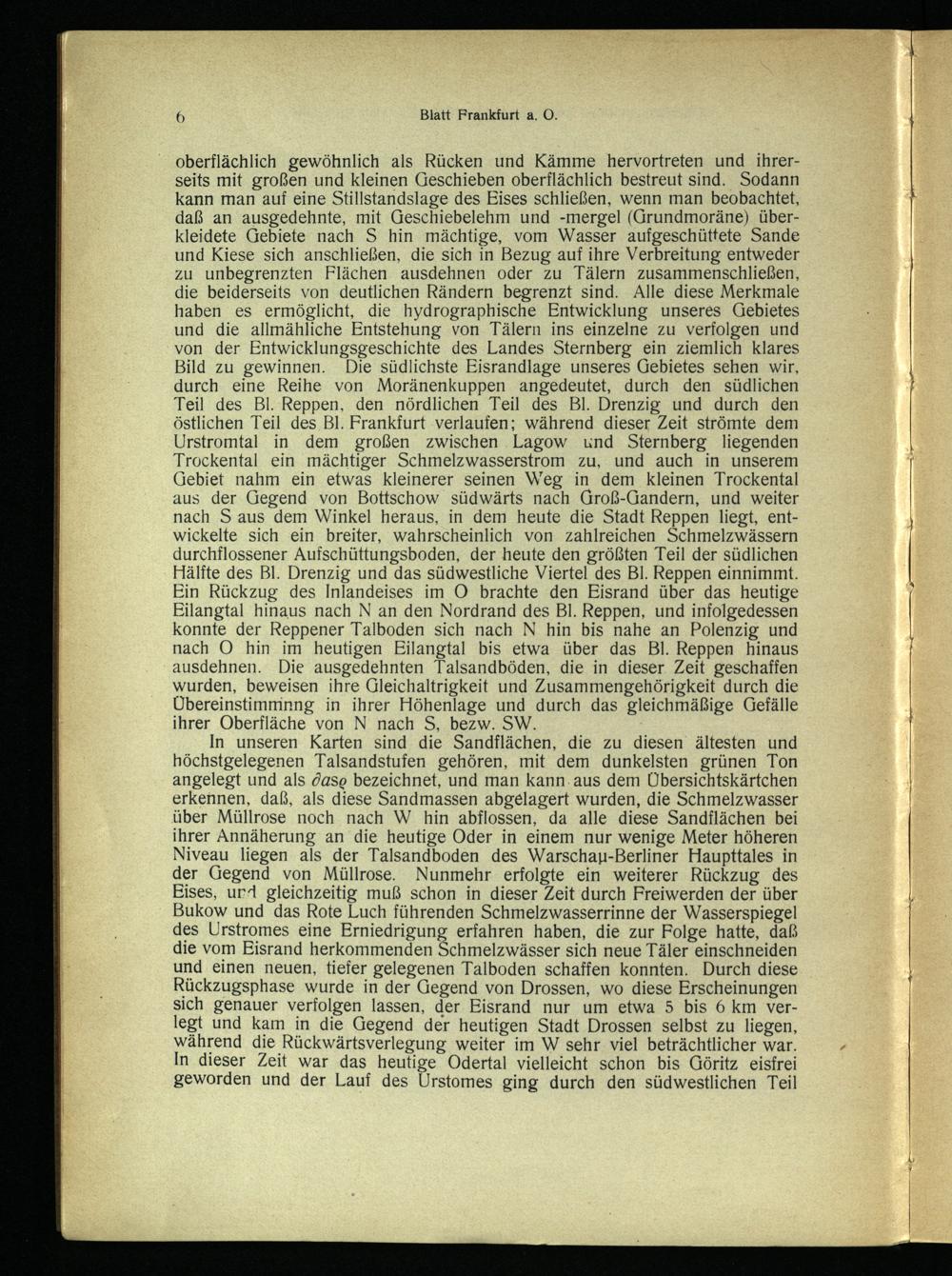 oberflächlich gewöhnlich als Rücken und Kämme hervortreten und ihrerseits mit großen und kleinen Geschieben oberflächlich bestreut sind. Sodann kann man auf eine Stillstandslage des Eises schließen, wenn man beobachtet, daß an ausgedehnte, mit Geschiebelehm und-mergel(Grundmoräne) überkleidete Gebiete nach S hin mächtige, vom Wasser aufgeschüttete Sande und Kiese sich anschließen, die sich in Bezug auf ihre Verbreitung entweder zu unbegrenzten Flächen ausdehnen oder zu Tälern zusammenschließen, die beiderseits von deutlichen Rändern begrenzt sind. Alle diese Merkmale haben es ermöglicht, die hydrographische Entwicklung unseres Gebietes und die allmähliche Entstehung von Tälern ins einzelne zu verfolgen und von der Entwicklungsgeschichte des Landes Sternberg ein ziemlich klares Bild zu gewinnen. Die südlichste Eisrandlage unseres Gebietes sehen wir, durch eine Reihe von Moränenkuppen angedeutet, durch den südlichen Teil des Bl. Reppen, den nördlichen Teil des Bl. Drenzig und durch den östlichen Teil des Bl. Frankfurt ‚verlaufen; während dieser Zeit strömte dem Urstromtal in dem großen zwischen.Lagow und Sternberg liegenden Trockental ein mächtiger Schmelzwasserstrom zu, und auch in unserem Gebiet nahm ein etwas kleinerer seinen Weg in dem kleinen Trockental aus der Gegend von Bottschow südwärts nach Groß-Gandern, und weiter nach S aus dem Winkel heraus, in dem heute die Stadt Reppen liegt, entwickelte sich ein breiter, wahrscheinlich von zahlreichen Schmelzwässern durchflossener Aufschüttungsboden, der heute den größten Teil der südlichen Hälfte des Bl. Drenzig und das südwestliche Viertel des Bl. Reppen einnimmt. Ein Rückzug des Inlandeises im O brachte den Eisrand über das heutige Eilangtal hinaus nach N an den Nordrand des Bl. Reppen, und infolgedessen konnte der Reppener Talboden sich nach N hin bis nahe an Polenzig und nach O hin im heutigen Eilangtal bis etwa über das Bl. Reppen hinaus ausdehnen. Die ausgedehnten Talsandböden, die in dieser. Zeit geschaffen wurden, beweisen ihre Gleichaltrigkeit und Zusammengehörigkeit durch die Übereinstimmnng in ihrer Höhenlage und durch das gleichmäßige Gefälle ihrer Oberfläche von N nach S, bezw. SW.