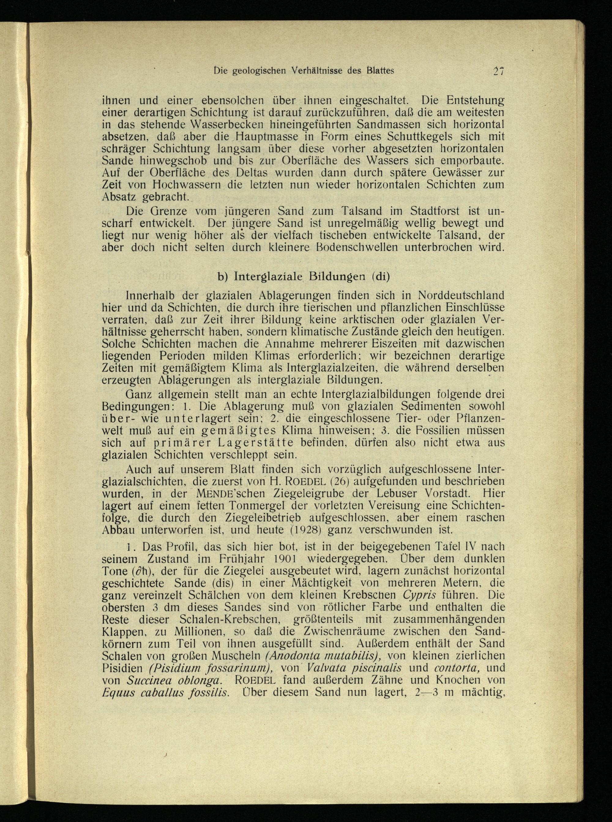 Auch auf unserem Blatt finden sich vorzüglich aufgeschlossene Interglazialschichten, die zuerst von H. ROEDEL(26) aufgefunden und beschrieben wurden, in der MENDE’schen Ziegeleigrube der Lebuser Vorstadt. Hier lagert auf einem fetten Tonmergel der vorletzten Vereisung eine Schichtenfolge, die durch den Ziegeleibetrieb aufgeschlossen, aber einem raschen Abbau unterworfen ist, und heute(1928) ganz verschwunden ist.