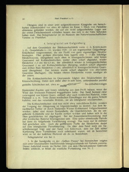 Übrigens sind in einer jetzt aufgeschlossenen Kiesgrube am benachbarten Judenkirchhof vor etwa 40 Jahren im Kiese 5 Stück von Paludina diluviana gefunden worden, die auf ein wohl aufgearbeitetes Lager aus der ersten Zwischeneiszeit schließen lassen, das sich in der Nähe befunden haben muß. Das Belegmaterial ist im Museum des Naturwissenschaftlichen Vereins zu Frankfurt .