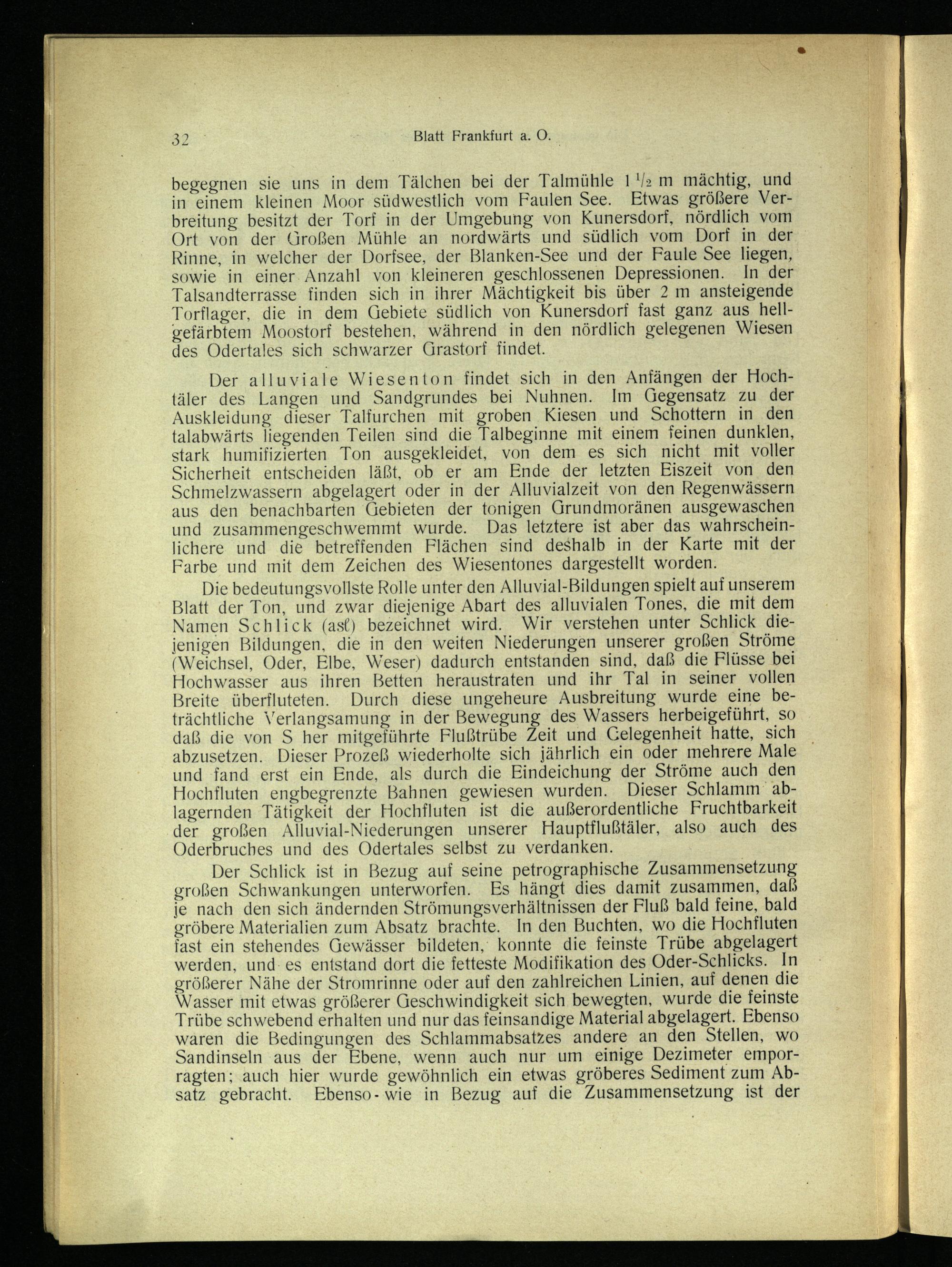 Die bedeutungsvollste Rolle unter den Alluvial-Bildungen spielt auf unserem Blatt der Ton, und zwar diejenige Abart des alluvialen Tones, die mit dem Namen Schlick(ast) bezeichnet wird. Wir verstehen unter Schlick diejenigen Bildungen, die in den weiten Niederungen unserer großen Ströme (Weichsel , Oder, Elbe , Weser ) dadurch entstanden sind, daß die Flüsse bei Hochwasser aus ihren Betten heraustraten und ihr Tal in seiner vollen Breite überfluteten. Durch diese ungeheure Ausbreitung wurde eine beträchtliche Verlangsamung in der Bewegung des Wassers herbeigeführt, So daß die von S her mitgeführte Flußtrübe Zeit und Gelegenheit hatte, sich abzusetzen. Dieser Prozeß wiederholte sich jährlich ein oder mehrere Male und fand erst ein Ende, als durch die Eindeichung der Ströme auch den Hochfluten engbegrenzte Bahnen gewiesen wurden. Dieser Schlamm ablagernden Tätigkeit der Hochfluten ist die außerordentliche Fruchtbarkeit der großen Alluvial-Niederungen unserer Hauptflußtäler, also auch des Oderbruches und des Odertales selbst zu verdanken.