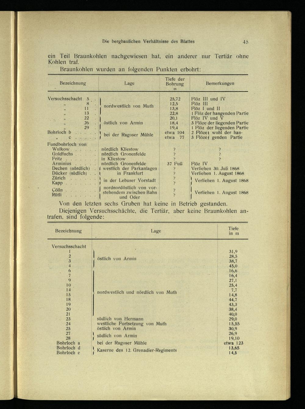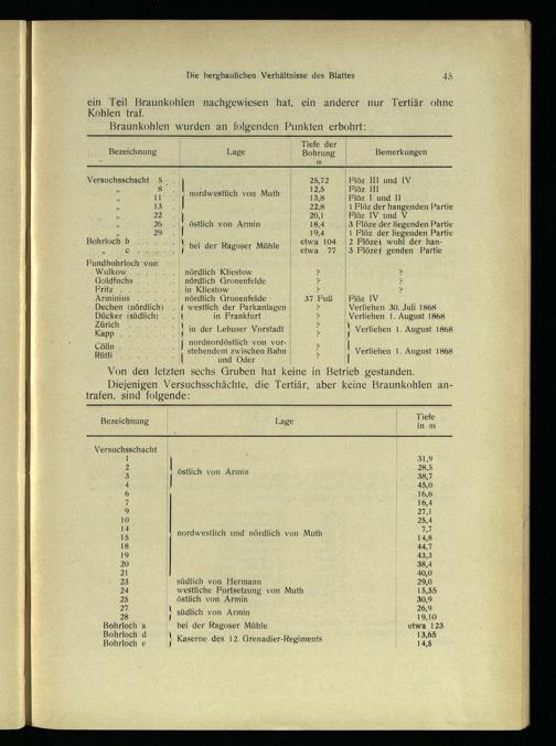 und Oder Von den letzten sechs Gruben hat keine in Betrieb gestanden. Diejenigen Versuchsschächte, die Tertiär, aber keine Braunkohlen antrafen, sind folgende: