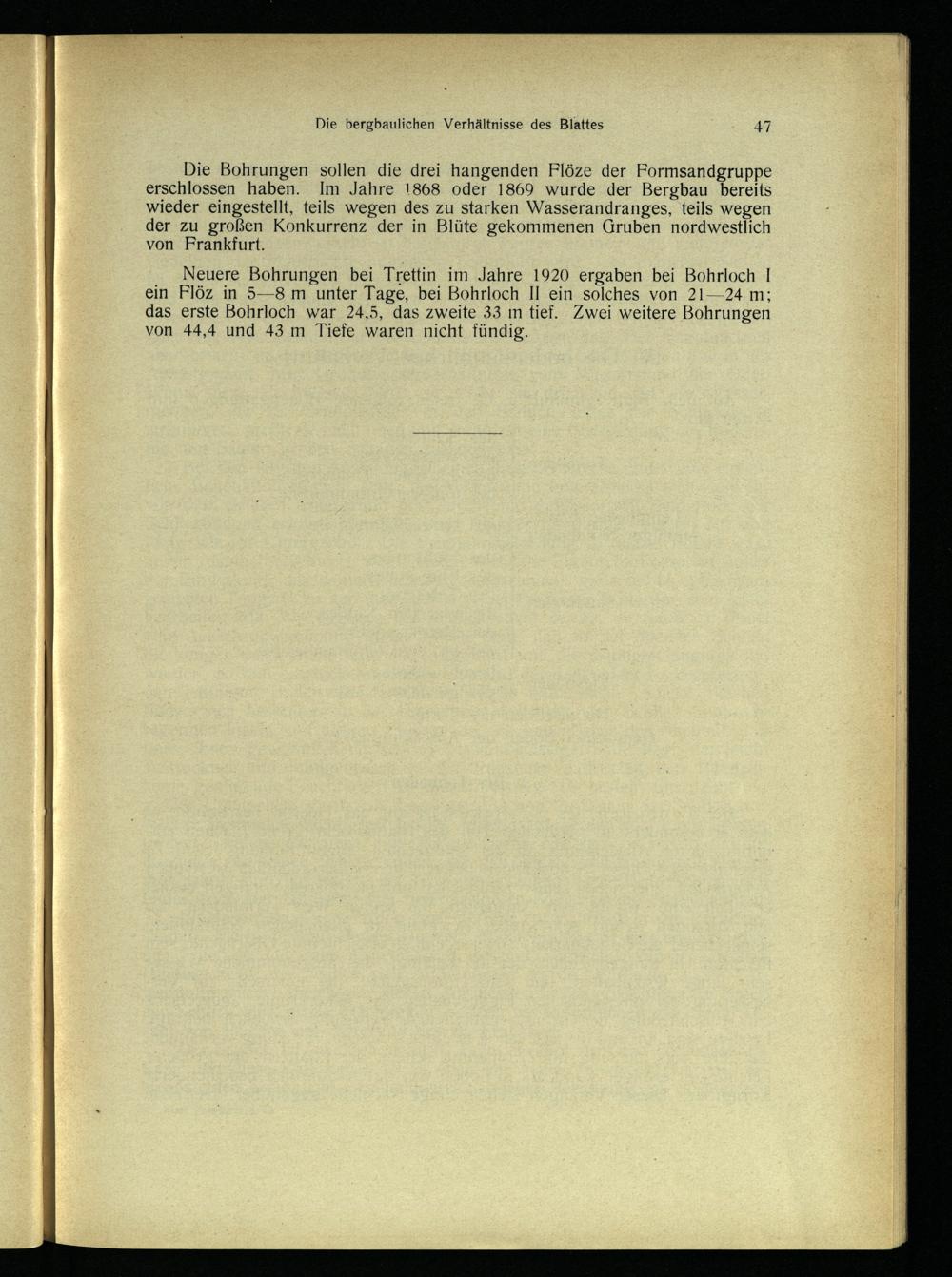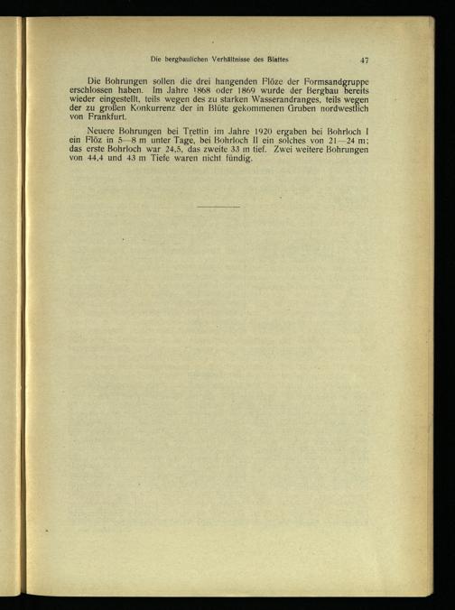 Neuere Bohrungen bei Trettin im Jahre 1920 ergaben bei Bohrloch I ein Flöz in 5—8 m unter Tage, bei Bohrloch II ein solches von 21—24 m; das erste Bohrloch war 24,5, das zweite 33 m tief. Zwei weitere Bohrungen von 44,4 und 43 m Tiefe waren nicht fündig.