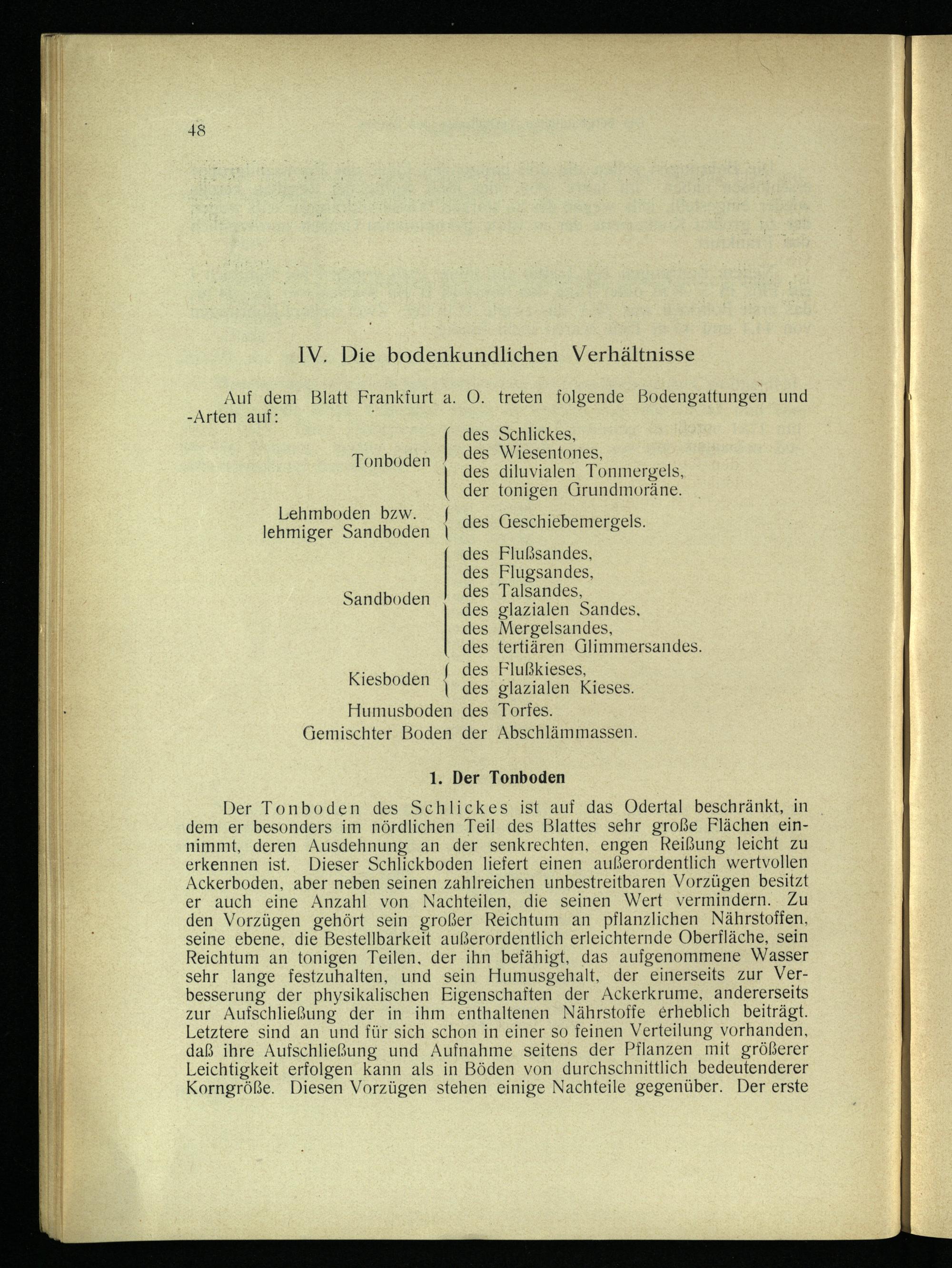Auf dem Blatt Frankfurt a. O. treten folgende Bodengattungen und -Arten auf:; ] des Schlickes, Tonboden} des Wiesentones, des diluvialen Tonmergels, der tonigen Grundmoräne. Lehmboden bzw.| AN SE lehmiger Sandboden| des Geschiebemergels. des Flußsandes, des Flugsandes, Sandboden} des Talsandes, des glazialen Sandes, des Mergelsandes, des tertiären Glimmersandes. des Flußkieses, des glazialen Kieses. Humusboden des Torfes. Gemischter Boden der Abschlämmassen.