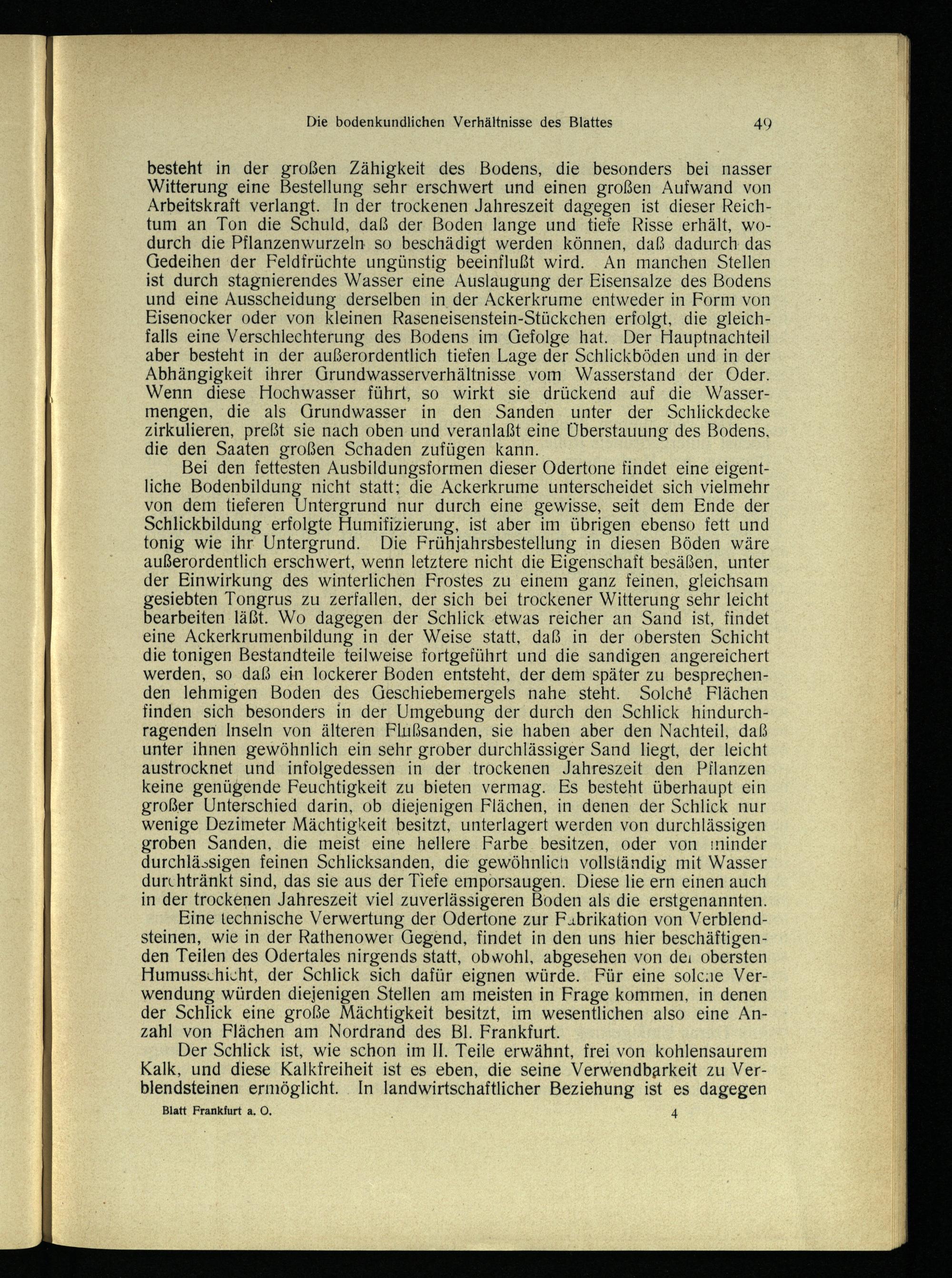 Eine technische Verwertung der Odertone zur Fubrikation von Verblendsteinen, wie in der Rathenower Gegend, findet in den uns hier beschäftigenden Teilen des Odertales nirgends statt, obwohl, abgesehen von deı obersten Humusschicht, der Schlick sich dafür eignen würde. Für eine solcae Verwendung würden diejenigen Stellen am meisten in Frage kommen, in denen der Schlick eine große Mächtigkeit besitzt, im wesentlichen also eine Anzahl von Flächen am Nordrand des Bl. Frankfurt.