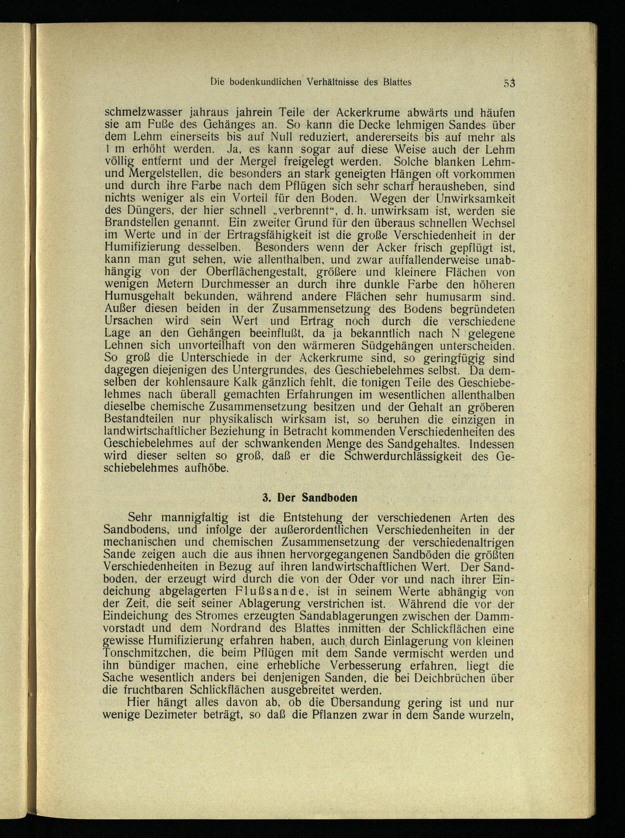 Sehr mannigfaltig ist die Entstehung der verschiedenen Arten des Sandbodens, und infolge der außerordentlichen Verschiedenheiten in der mechanischen und chemischen Zusammensetzung ‚der verschiedenaltrigen Sande zeigen auch die aus ihnen hervorgegangenen Sandböden die größten Verschiedenheiten in Bezug auf ihren landwirtschaftlichen. Wert. Der Sandboden, der erzeugt wird durch die von. der Oder vor und nach ihrer Eindeichung abgelagerten Flußsande;, ist in seinem Werte abhängig ‚von der Zeit, die seit seiner Ablagerung verstrichen ist.. Während die vor. der Eindeichung des Stromes erzeugten Sandablagerungen zwischen der. Dammvorstadt und dem Nordrand des Blattes inmitten. der Schlickflächen eine gewisse Humifizierung erfahren haben, auch, durch Einlagerung von kleinen Tonschmitzchen, die beim Pflügen mit dem Sande vermischt werden und ihn bündiger machen, eine erhebliche Verbesserung erfahren, liegt die Sache wesentlich anders bei denjenigen Sanden, die bei Deichbrüchen über die fruchtbaren Schlickflächen ausgebreitet werden.