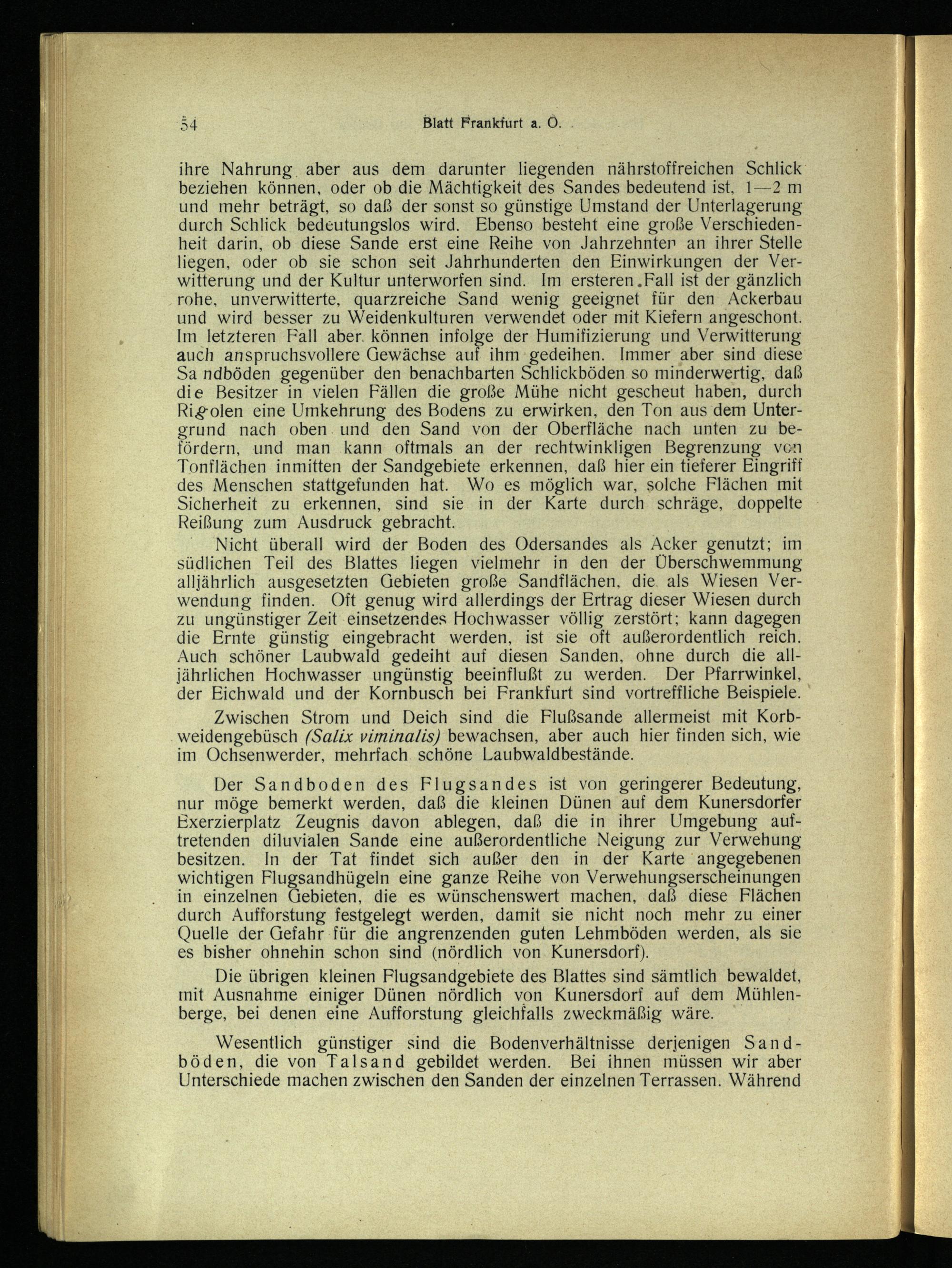Nicht überall wird der Boden des Odersandes als Acker genutzt; im südlichen Teil des Blattes liegen vielmehr in den der Überschwemmung alljährlich ausgesetzten Gebieten große Sandflächen, die. als Wiesen Verwendung finden. Oft genug wird allerdings der Ertrag dieser Wiesen durch zu ungünstiger Zeit ‚einsetzendes Hochwasser völlig zerstört; kann dagegen die Ernte günstig eingebracht werden, ist sie oft außerordentlich reich. Auch schöner Laubwald gedeiht auf diesen Sanden, ohne durch die alljährlichen Hochwasser ungünstig beeinflußt zu werden. Der Pfarrwinkel, der Eichwald und der Kornbusch bei Frankfurt sind vortreffliche Beispiele.