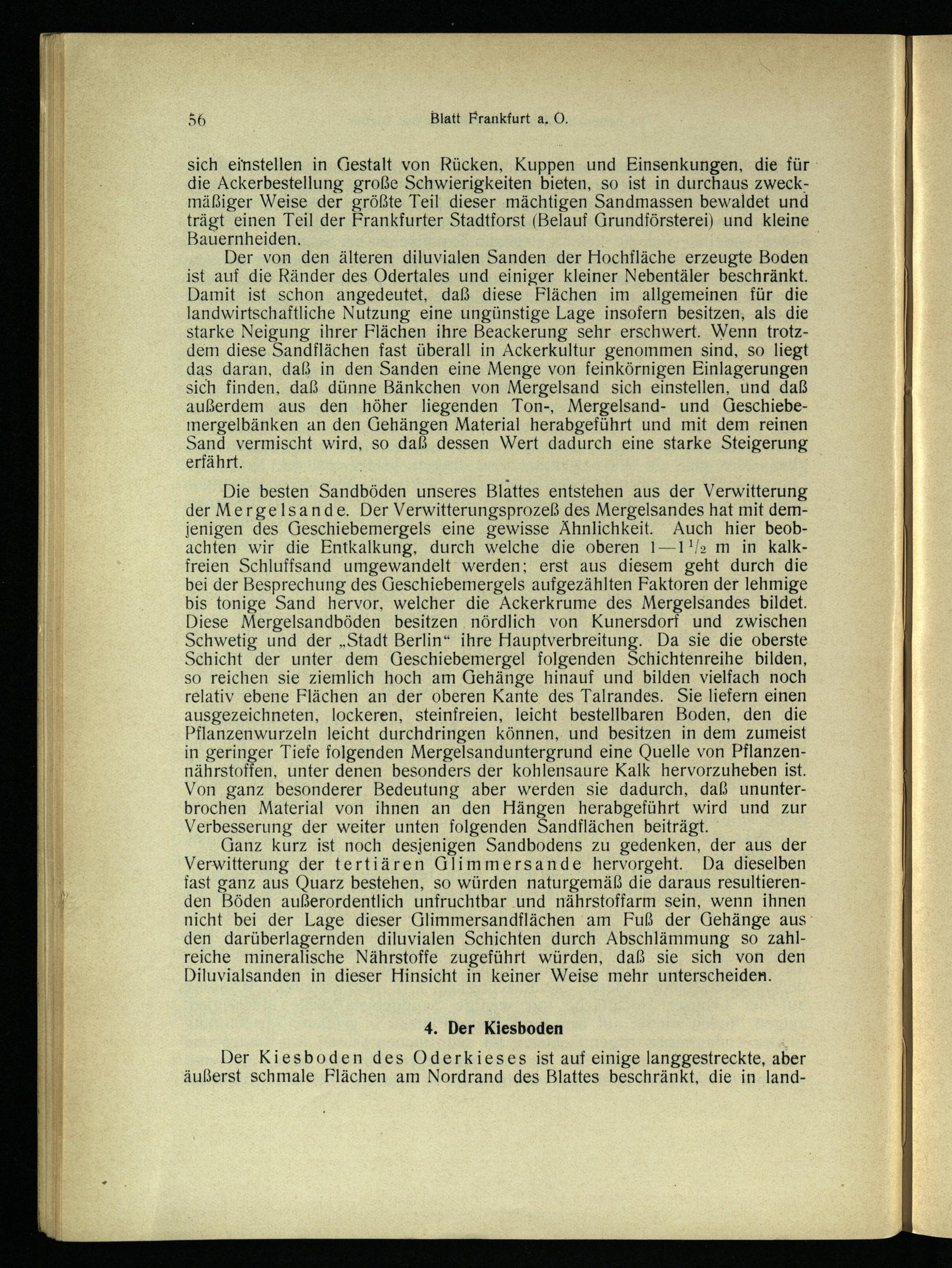Der von den älteren diluvialen Sanden der Hochfläche erzeugte Boden ist auf die Ränder des Odertales und einiger kleiner Nebentäler beschränkt. Damit ist schon angedeutet, daß diese Flächen im allgemeinen für die landwirtschaftliche Nutzung eine ungünstige Lage insofern besitzen; als die starke Neigung ihrer Flächen ihre Beackerung sehr erschwert. Wenn trotzdem diese Sandflächen fast überall in Ackerkultur genommen sind, so liegt das daran, daß in den Sanden eine Menge von feinkörnigen Einlagerungen sich finden, daß dünne Bänkchen von Mergelsand sich einstellen, und daß außerdem aus den höher liegenden Ton-, Mergelsand- und Geschiebemergelbänken an den Gehängen Material herabgeführt und mit dem reinen Sand vermischt wird, so daß dessen Wert dadurch eine starke Steigerung erfährt.