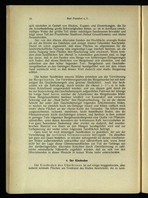 sich einstellen in Gestalt von Rücken, Kuppen und Einsenkungen, die für die Ackerbestellung große Schwierigkeiten bieten, so ist in durchaus zweckmäßiger Weise der größte Teil dieser mächtigen Sandmassen bewaldet und trägt einen Teil der Frankfurter Stadtforst(Belauf Grundförsterei) und kleine Bauernheiden.|