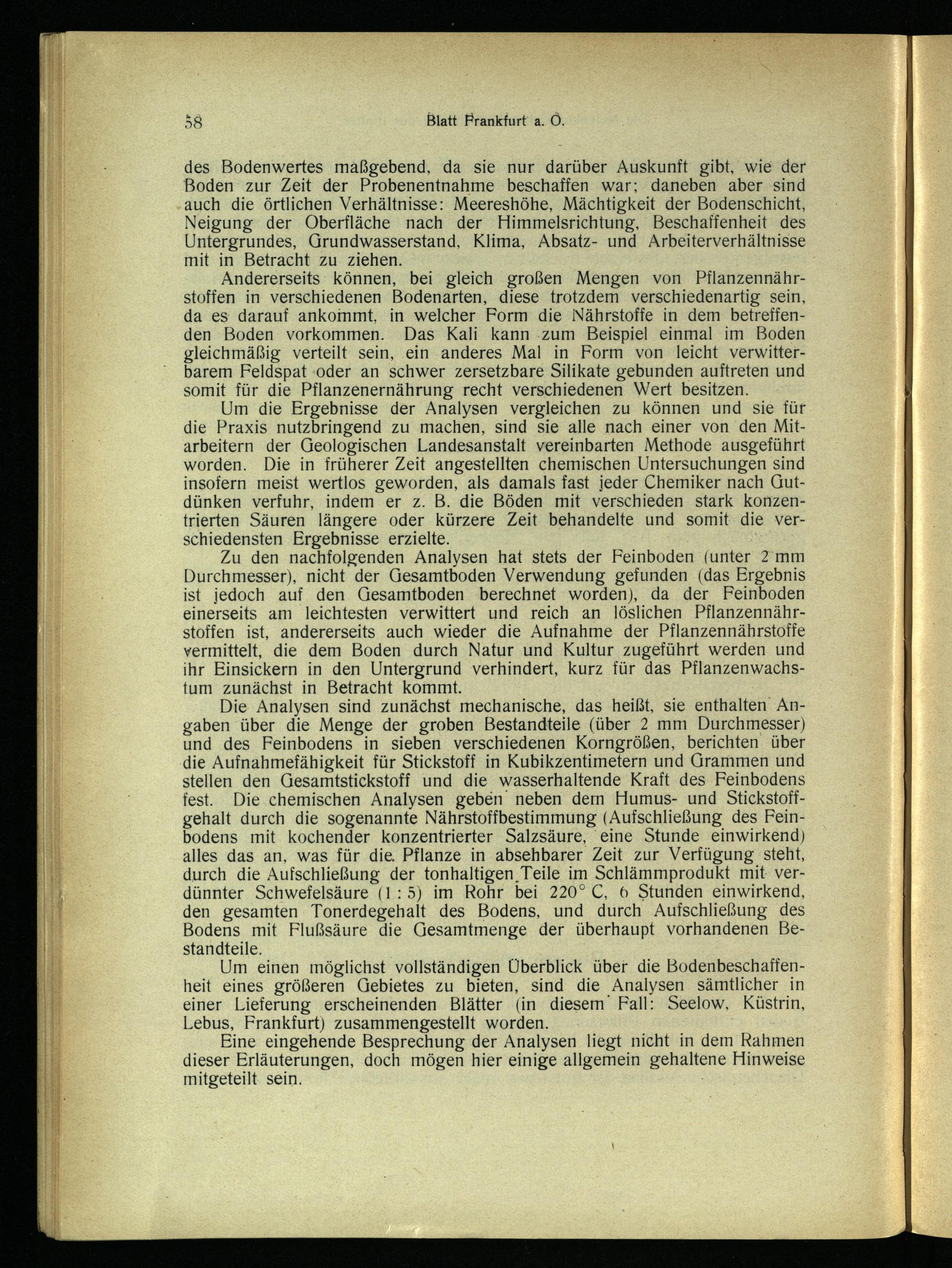 Um einen möglichst vollständigen Überblick über die Bodenbeschaffenheit eines größeren Gebietes zu bieten, sind die Analysen sämtlicher in einer Lieferung erscheinenden Blätter(in diesem‘ Fall: Seelow , Küstrin , Lebus , Frankfurt ) zusammengestellt worden.
