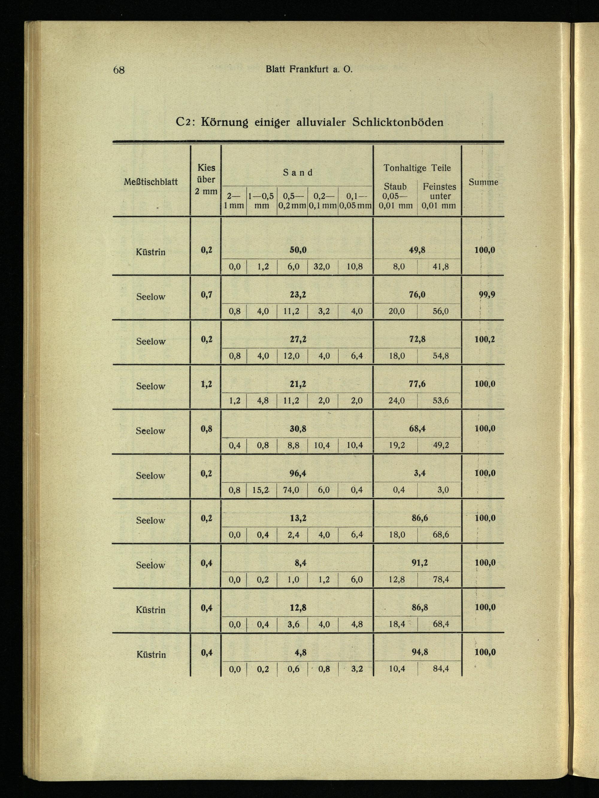 Blatt Frankfurt a. O. C2: Körnung einiger alluvialer Schlicktonböden Meßtischblatt Küstrin Seelow Seelow Seelow Seelow Seelow Seelow Küstrin Küstrin Kies über 2 mm Sand Tonhaltige Teile UT—| Staub| Feinstes 0,5 0,2 0,1—-| 0,05 unter 0,2 mm|0,1 mm|0,05mm| 0,01 mm 0,01 mm 2 1—0,5 1mm| mm Summe