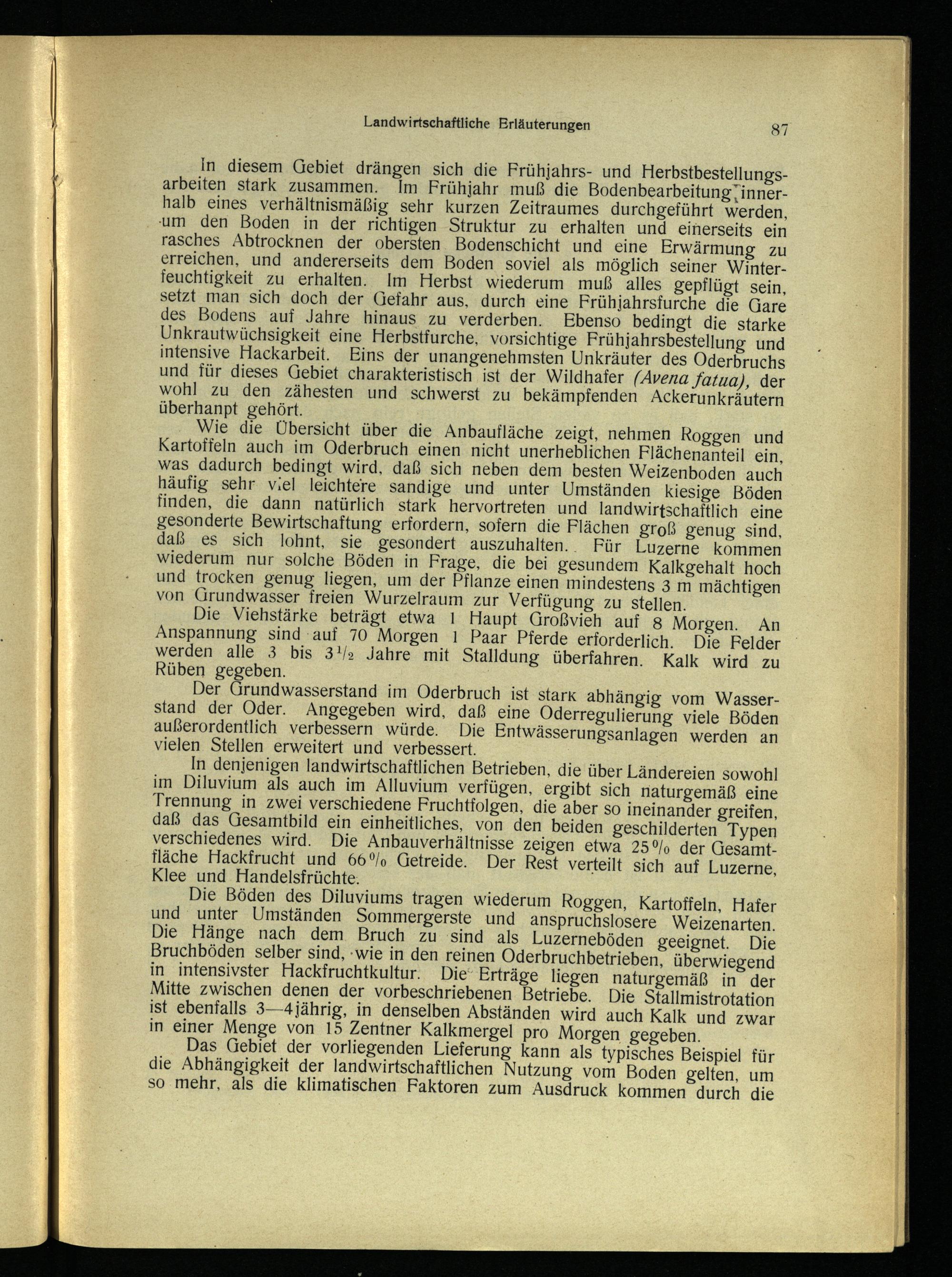 in diesem Gebiet drängen sich die Frühjahrs- und Herbstbestellungsarbeiten stark zusammen. Im Frühjahr muß die Bodenbearbeitung Tinnerhalb eines verhältnismäßig sehr kurzen Zeitraumes durchgeführt werden, um den Boden in der richtigen Struktur zu erhalten und einerseits ein rasches Abtrocknen der obersten. Bodenschicht und eine Erwärmung zu erreichen, und andererseits dem Boden soviel als möglich seiner Winterfeuchtigkeit zu erhalten. Im Herbst wiederum muß alles gepflügt sein, setzt man sich doch der Gefahr aus, durch eine Frühjahrsfurche die Gare des Bodens auf Jahre hinaus zu verderben. Ebenso bedingt die starke Unkrautwüchsigkeit eine Herbstfurche, vorsichtige Frühjahrsbestellung und intensive Hackarbeit. Eins der unangenehmsten Unkräuter des Oderbruchs und für dieses Gebiet charakteristisch ist der Wildhafer(Avena fatua), der wohl zu den zähesten und schwerst zu bekämpfenden Ackerunkräutern überhanpt gehört.