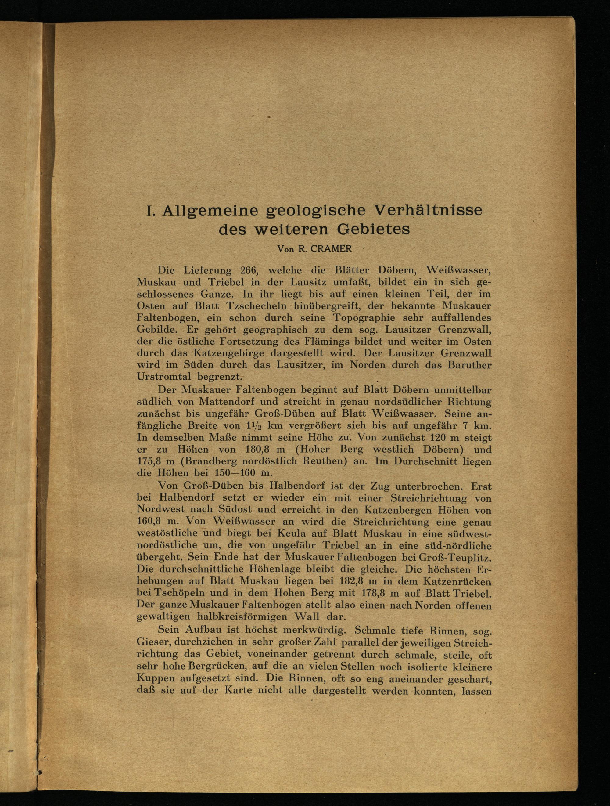 Die Lieferung 266, welche die Blätter Döbern , Weißwasser , Muskau und Triebel in der Lausitz umfaßt, bildet ein in sich geschlossenes Ganze. In ihr liegt bis auf einen kleinen Teil, der im Osten auf Blatt Tzschecheln hinübergreift, der bekannte Muskauer Faltenbogen , ein schon durch seine Topographie sehr auffallendes Gebilde. Er gehört geographisch zu dem sog. Lausitzer Grenzwall, der die östliche Fortsetzung des Flämings bildet und weiter im Osten durch das Katzengebirge dargestellt wird. Der Lausitzer Grenzwall wird im Süden durch das Lausitzer, im Norden durch das Baruther Urstromtal begrenzt. S