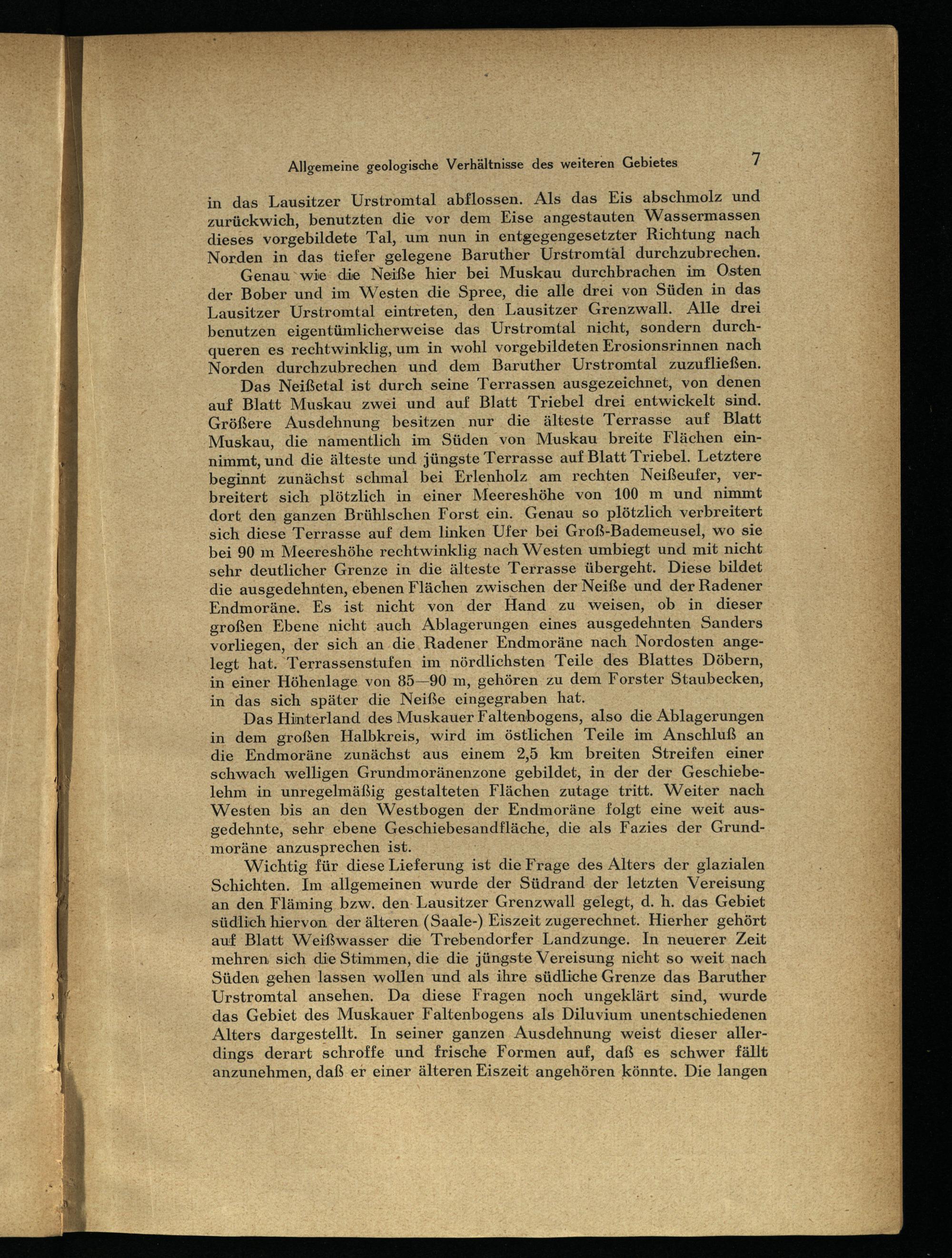 Das Neißetal ist durch seine Terrassen ausgezeichnet, von denen auf Blatt Muskau zwei und auf Blatt Triebel drei entwickelt sind. Größere Ausdehnung besitzen nur die älteste Terrasse auf Blatt Muskau , die namentlich im Süden von Muskau breite Flächen einnimmt, und die älteste und jüngste Terrasse auf Blatt Triebel. Letztere beginnt zunächst schmal bei Erlenholz am rechten Neißeufer, verbreitert sich plötzlich in einer Meereshöhe von 100 m und nimmt dort den ganzen Brühlschen Forst ein. Genau so plötzlich verbreitert sich diese Terrasse auf dem linken Ufer bei Groß-Bademeusel, wo sie bei 90 m Meereshöhe rechtwinklig nach Westen umbiegt und mit nicht sehr deutlicher Grenze in die älteste Terrasse übergeht. Diese bildet die ausgedehnten, ebenen Flächen zwischen der Neiße und der Radener Endmoräne. Es ist nicht von der Hand zu weisen, ob in dieser großen Ebene nicht auch Ablagerungen eines ausgedehnten Sanders vorliegen, der sich an die, Radener Endmoräne nach Nordosten angelegt hat. Terrassenstufen im nördlichsten Teile des Blattes Döbern , in einer Höhenlage von 85—90 m, gehören zu dem Forster Staubecken, in das sich später die Neiße eingegraben hat.