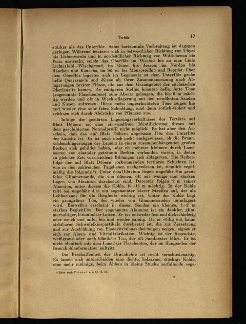 stärker als das Unterflöz. Seine horizontale Verbreitung ist dagegen geringer. Während letzteres sich in ostwestlicher Richtung von Uhyst bis Liebenwerda und in nordsüdlicher Richtung von Wittichenau bis Peitz erstreckt, reicht das Oberflöz im Westen bis an eine Linie Lichterfeld—-Wischgrund, im Osten bis Jessen, im Norden bis Räschen und Kauscha, im Süren bis Meurostollen und Reppist. Über dem Oberflöz lagerten sich im Gegensatz zu dem Unterflöz grobe helle Quarzsande und-Kiese ab, ihrer Zusammensetzung nach Ablagerungen breiter Flüsse, die aus dem Granitgebiet der sächsischen Oberlausitz kamen. An ruhigeren Stellen konnten helle, fette Tone (sogenannte Flaschentone) zum Absatz gelangen, die bis 8 m mächtig werden und oft in Wechsellagerung mit den erwähnten Sanden und Kiesen auftreten. Diese meist ungeschichteten Tone zeigen hin und wieder eine sehr feine Schichtung, sind dann rötlich-violett und zeichnen sich durch Abdrücke von Pflanzen aus.