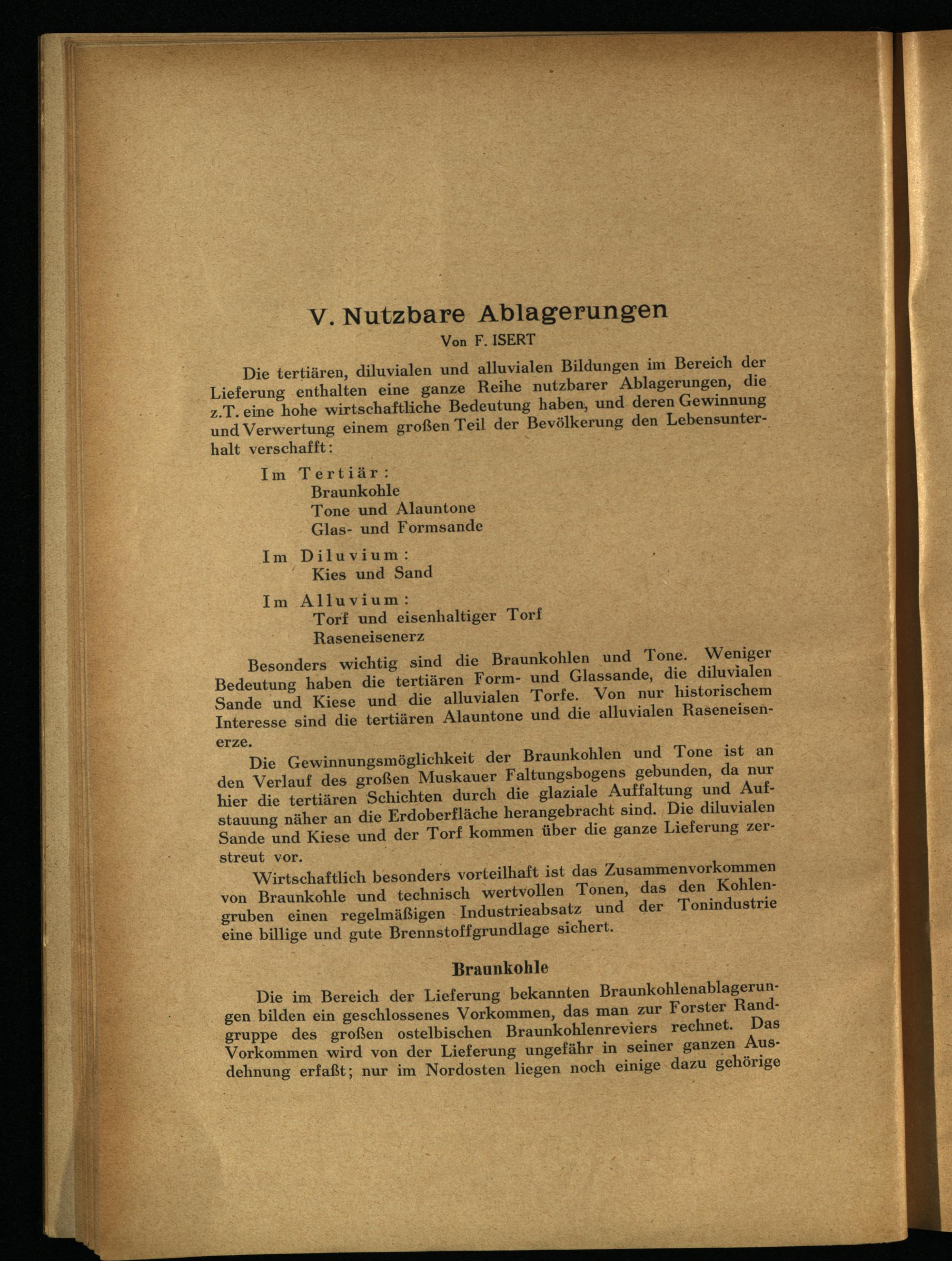 Die tertiären, diluvialen und alluvialen Bildungen im Bereich der Lieferung enthalten eine ganze Reihe nutzbarer Ablagerungen, die, 7.T. eine hohe wirtschaftliche Bedeutung haben, und. deren Gewinnung und Verwertung einem großen Teil der Bevölkerung den Lebensunterhalt verschafft: