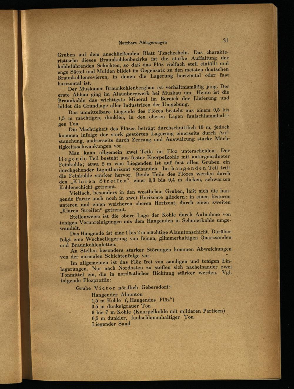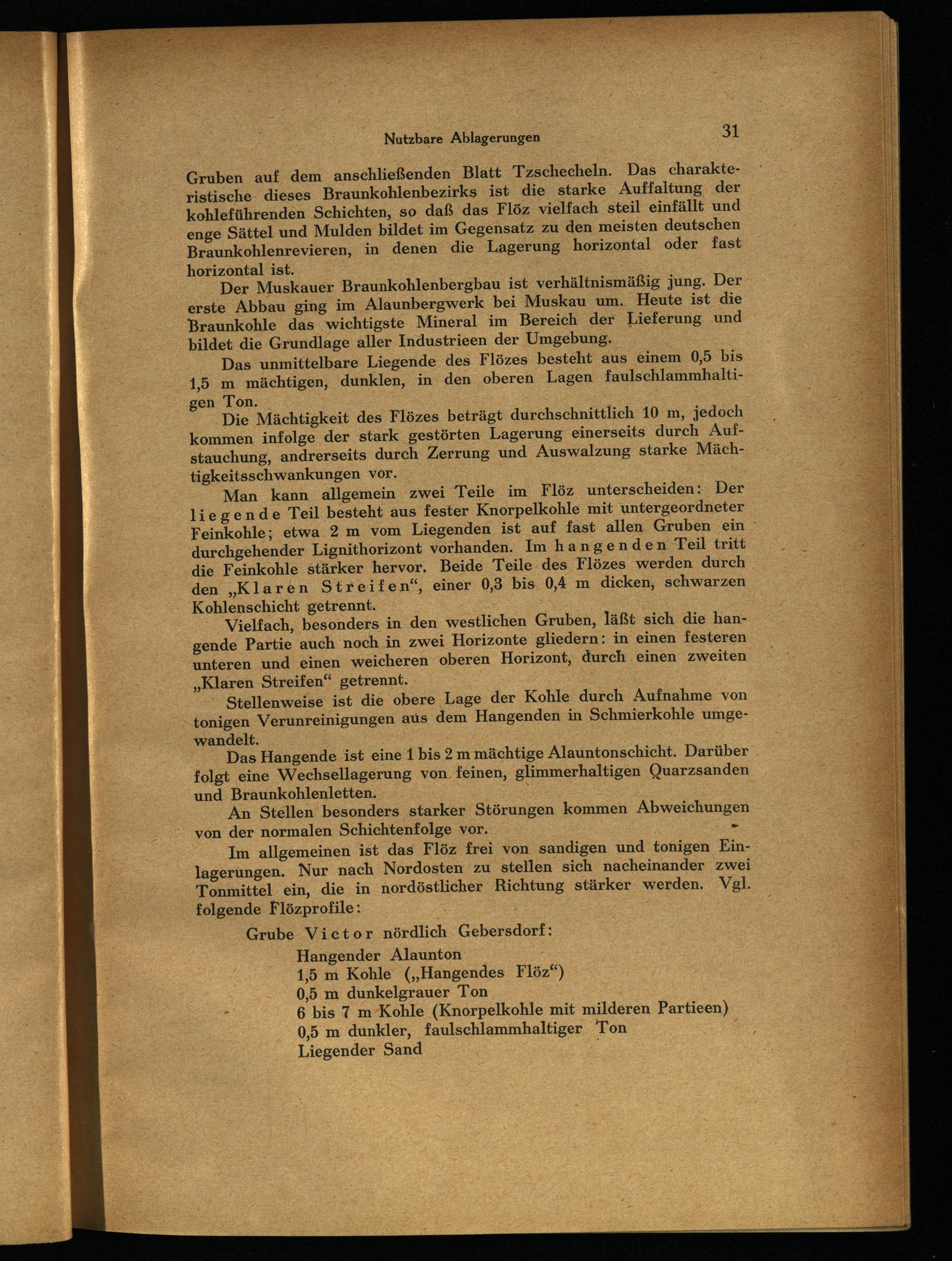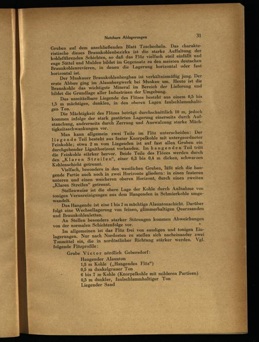 Grube Victor nördlich Gebersdorf : Hangender Alaunton 1,5 m Kohle(„Hangendes Flöz“) 0,5 m dunkelgrauer Ton 6 bis 7 m Kohle(Knorpelkohle mit milderen Partieen) 0,5 m dunkler, faulschlammhaltiger Ton. Liegender Sand|