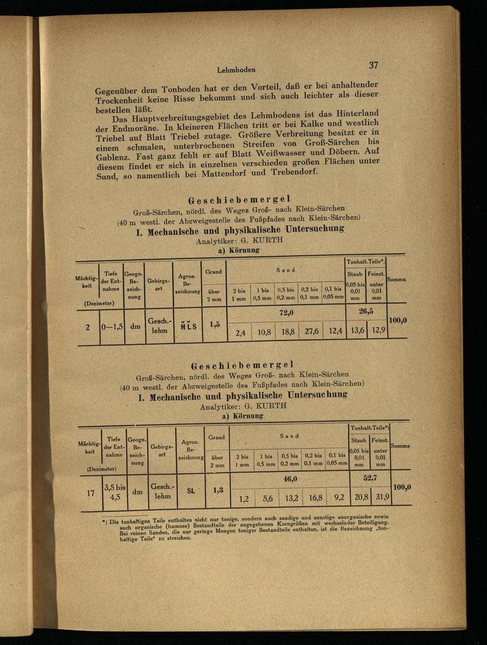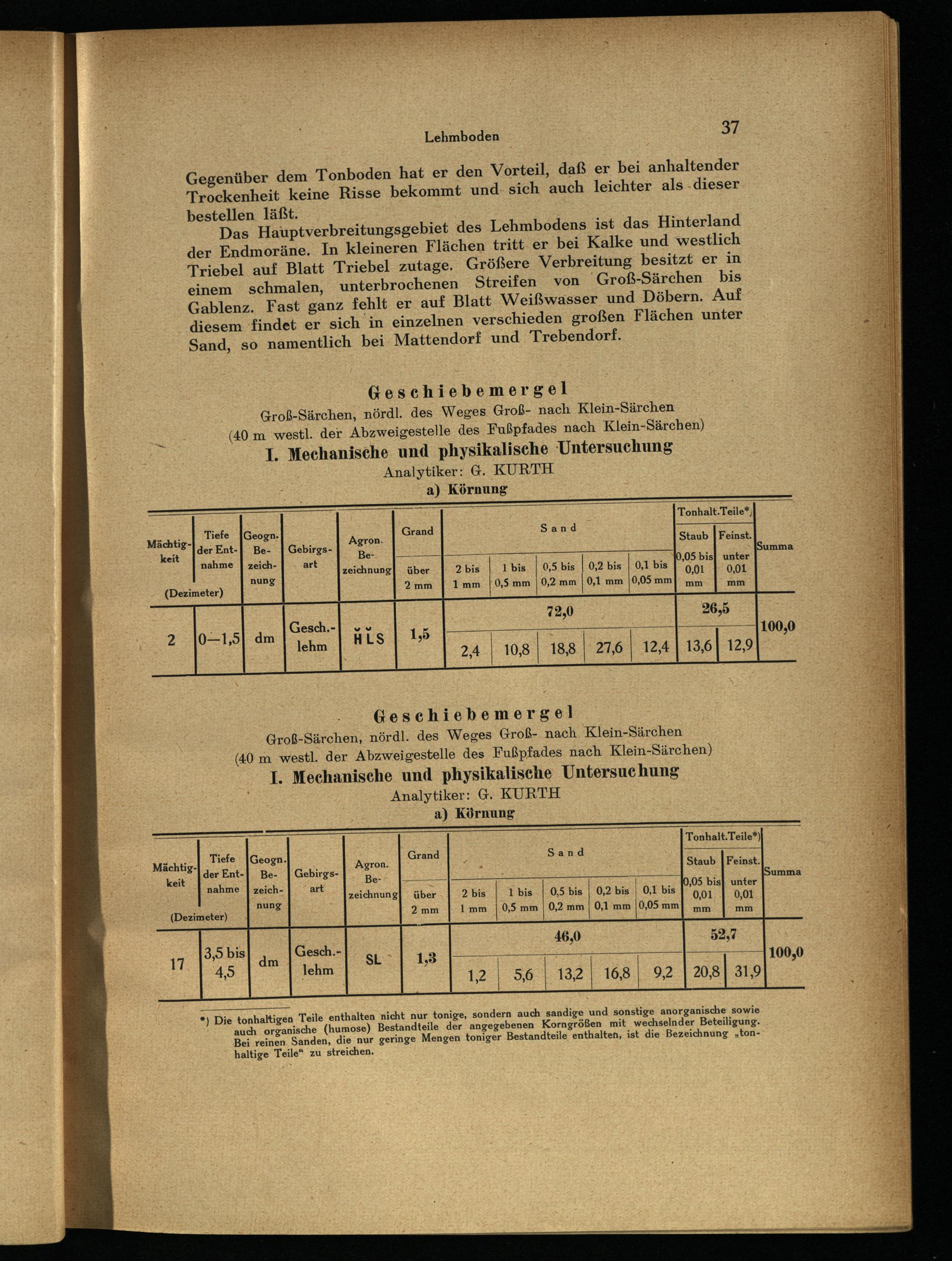 Geschiebemergel Groß-Särchen , nördl. des Weges Groß- nach Klein-Särchen (40 m westl. der Abzweigestelle des Fußpfades nach Klein-Särchen) 1. Mechanische und physikalische Untersuchung Analytiker: G. KURTH a) Körnung