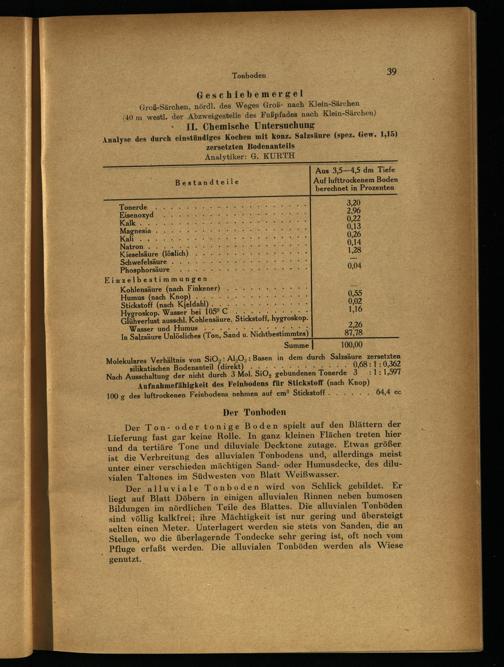 Geschiebemergel Groß-Särchen, nördl. des Weges Groß- nach Klein-Särchen (40 m west]. der Abzweigestelle des Fußpfades nach Klein-Särchen) + II. Chemische Untersuchung Analyse des durch einstündiges Kochen mit konz. Salzsäure(spez. Gew. 1,15) zersetzten Bodenanteils Analytiker: G. KURTH