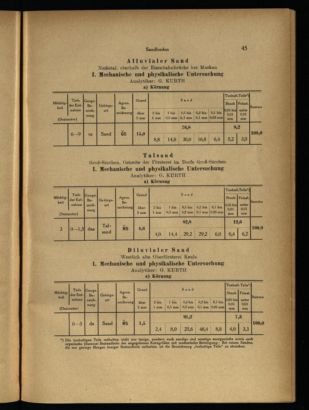 Talsand Groß-Särchen, Ostseite der Försterei im Dorfe Groß-Särchen I. Mechanische und physikalische Untersuchung Analytiker: G. KURTH a) Körnung