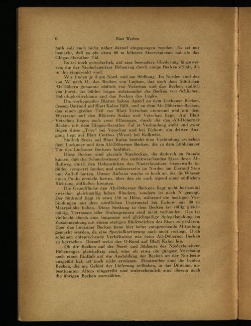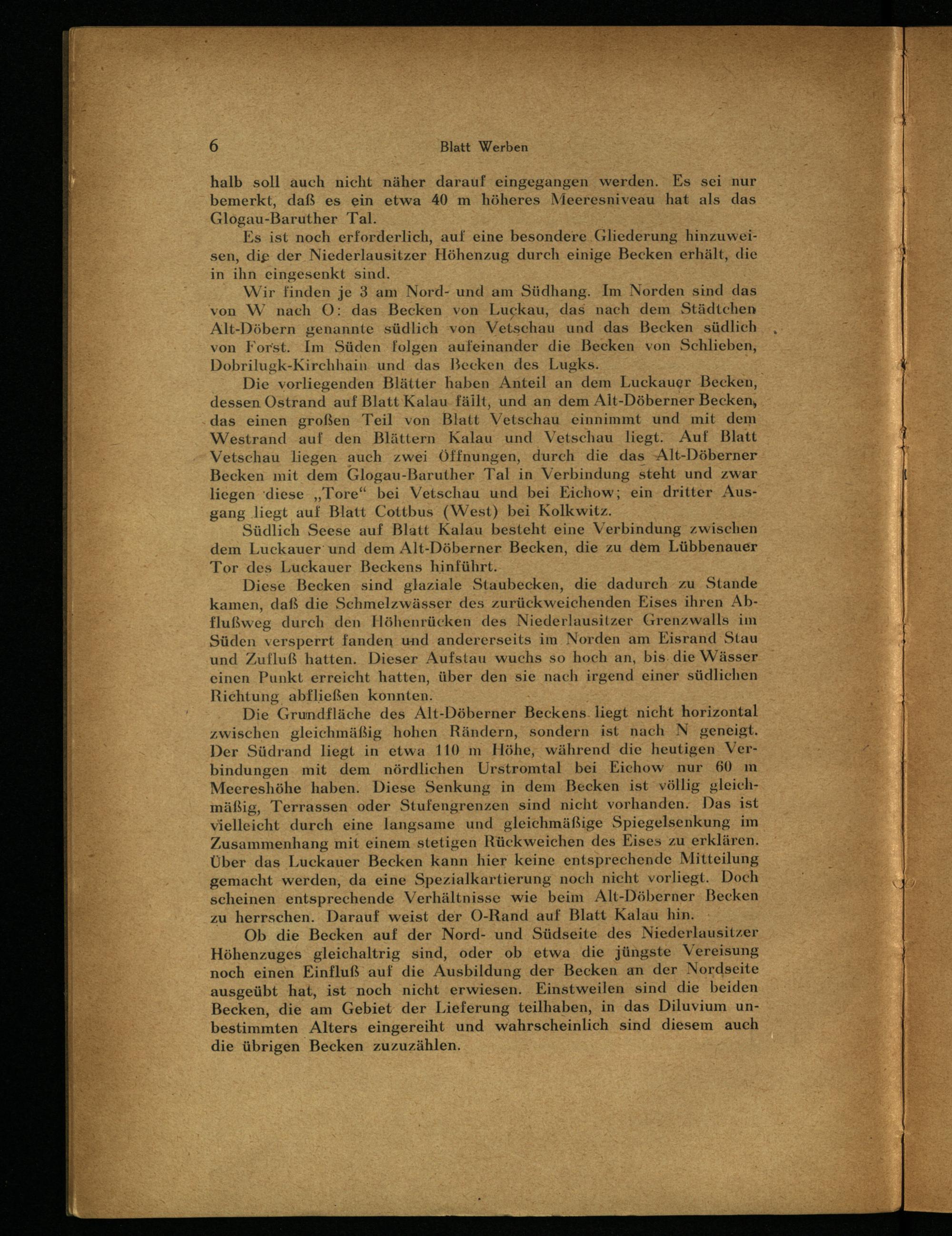 Die Grundfläche des Alt-Döberner Beckens. liegt nicht horizontal zwischen gleichmäßig hohen Rändern, sondern ist nach N geneigt. Der Südrand liegt in etwa 110 m Höhe, während die heutigen. Verbindungen mit dem nördlichen Urstromtal bei Eichow nur 60 m Meereshöhe haben. Diese Senkung in dem Becken ist völlig gleichmäßig, Terrassen oder Stufengrenzen sind nicht vorhanden. Das ist vielleicht durch eine langsame und gleichmäßige Spiegelsenkung im Zusammenhang mit einem stetigen Rückweichen des Eises zu erklären. Über das Luckauer Becken kann hier keine entsprechende Mitteilung gemacht werden, da eine Spezialkartierung noch nicht vorliegt. Doch scheinen entsprechende Verhältnisse wie beim Alt-Döberner Becken zu herrschen. Darauf weist der O-Rand auf Blatt Kalau hin.