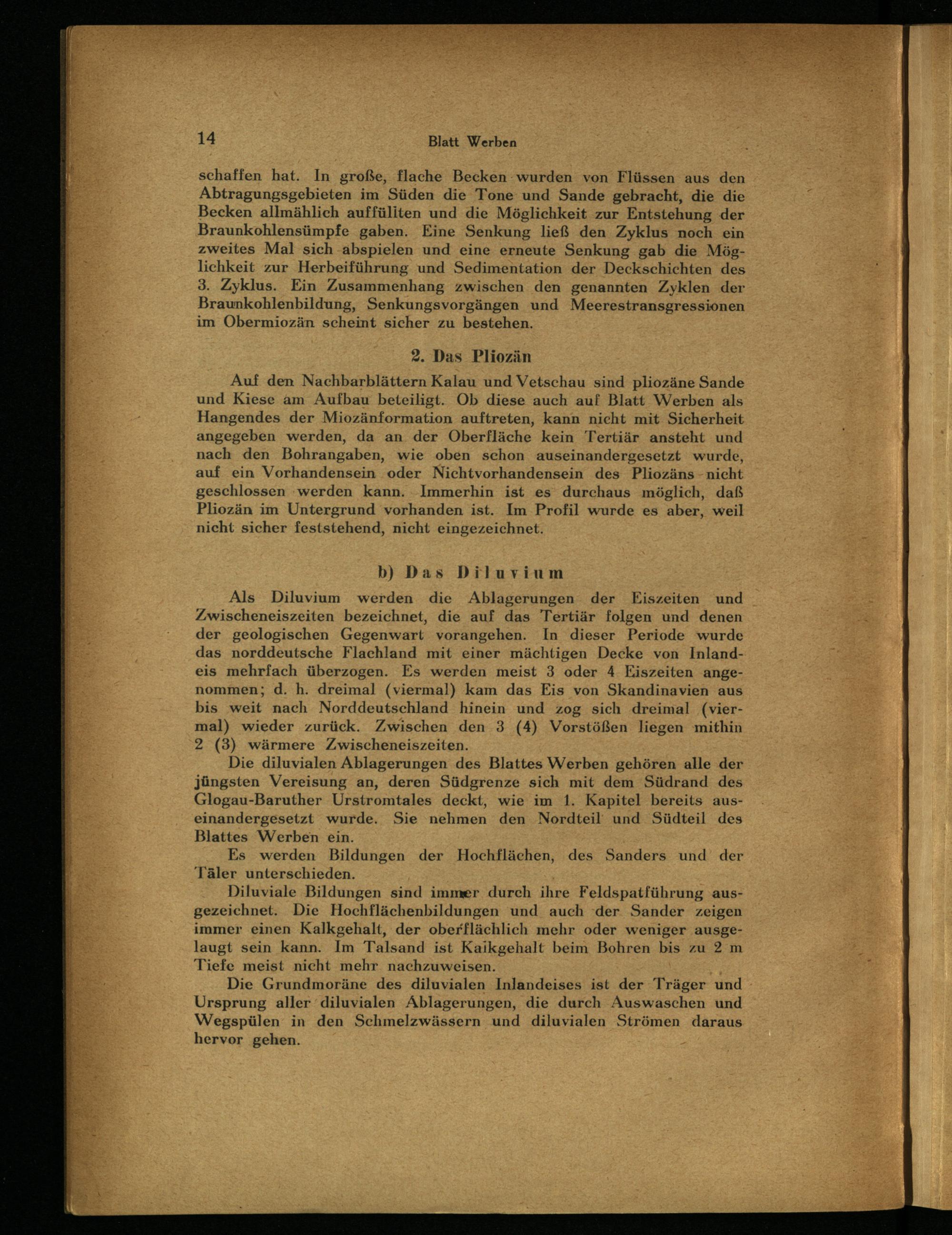 Auf den Nachbarblättern Kalau und Vetschau sind pliozäne Sande und Kiese am Aufbau beteiligt. Ob diese auch auf Blatt Werben als Hangendes der Miozänformation auftreten, kann nicht mit Sicherheit angegeben werden, da an der Oberfläche kein Tertiär ansteht und nach den Bohrangaben, wie oben schon auseinandergesetzt wurde, auf ein Vorhandensein oder Nichtvorhandensein des Pliozäns -nicht geschlossen ‚werden kann. Immerhin ist es durchaus möglich, daß Pliozän im Untergrund vorhanden ist. Im Profil wurde es aber, weil nicht sicher feststehend, nicht eingezeichnet.