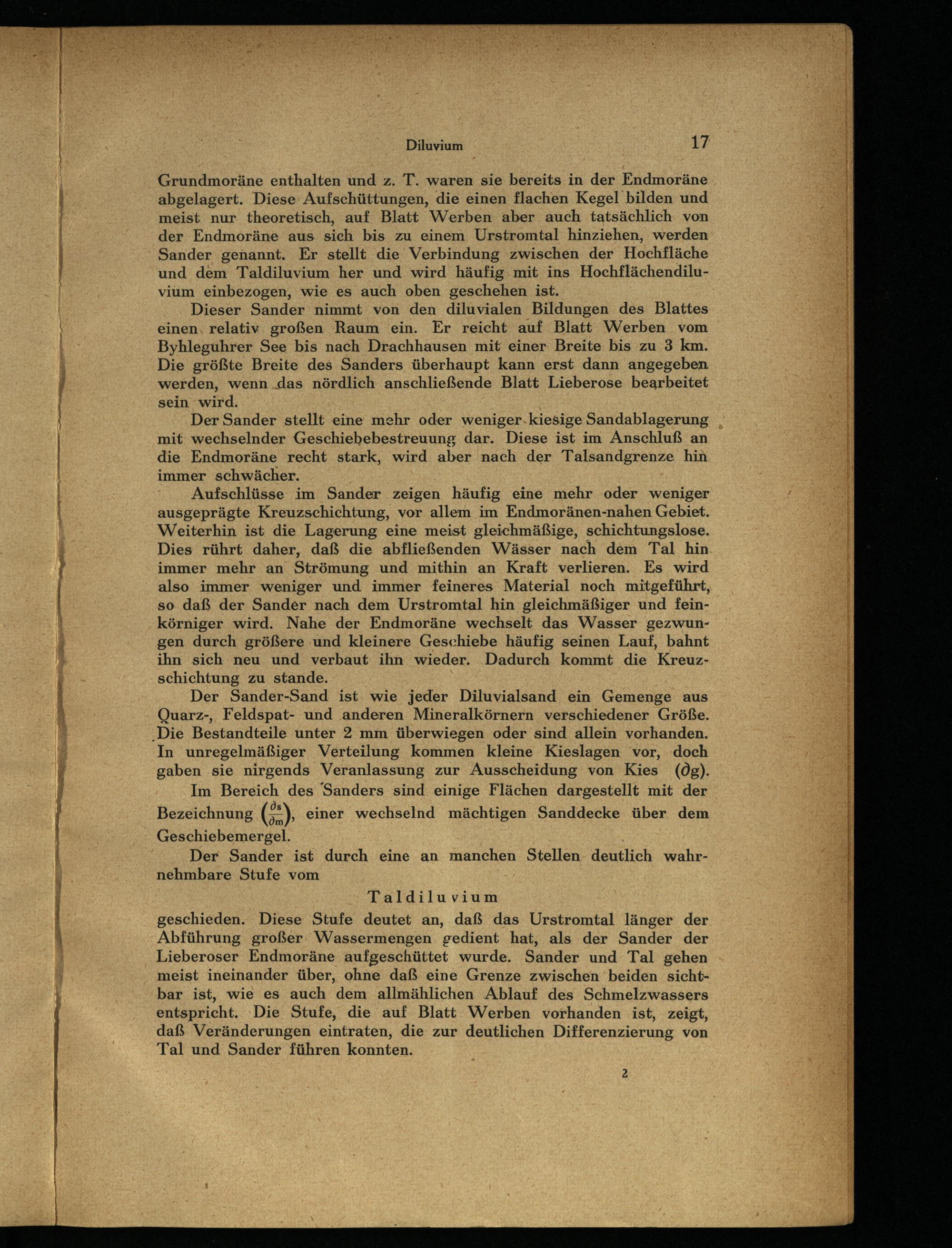 Grundmoräne enthalten und z, T. waren sie bereits in der Endmoräne abgelagert. Diese Aufschüttungen, die einen flachen Kegel bilden und meist nur theoretisch, auf Blatt Werben aber auch tatsächlich. von der Endmoräne aus sich bis zu einem Urstromtal hinziehen, werden Sander genannt. Er stellt die Verbindung zwischen der Hochfläche und dem Taldiluvium her und wird häufig mit ins Hochflächendiluvium einbezogen, wie es auch oben geschehen ist.