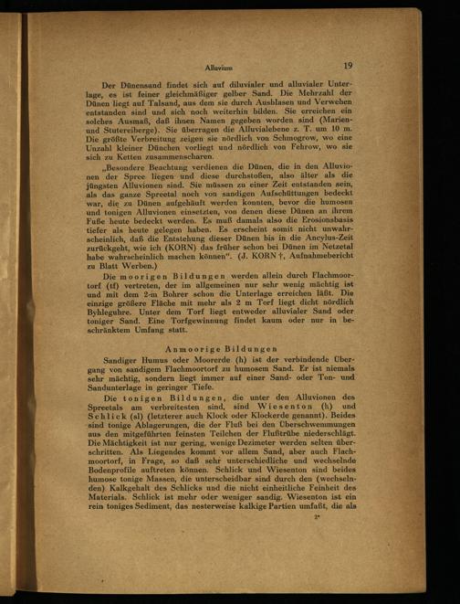 „Besondere Beachtung verdienen die Dünen, die in den Alluvionen der Spree liegen und diese durchstoßen, also älter als die jüngsten Alluvionen sind. Sie müssen zu einer Zeit entstanden sein, als das ganze Spreetal noch von sandigen Aufschüttungen bedeckt war, die zu Dünen aufgehäuft werden konnten, bevor die humosen und tonigen Alluvionen einsetzten, von denen diese Dünen, an ihrem Fuße heute bedeckt werden. Es muß damals also die Erosionsbasis tiefer als heute gelegen haben. Es erscheint somit nicht unwahrscheinlich, daß die Entstehung dieser Dünen bis in die Ancylus-Zeit zurückgeht, wie ich(KORN) das früher schon bei.Dünen im Netzetal habe wahrscheinlich machen können“.(J. KORN+, Aufnahmebericht zu Blatt Werben.)|