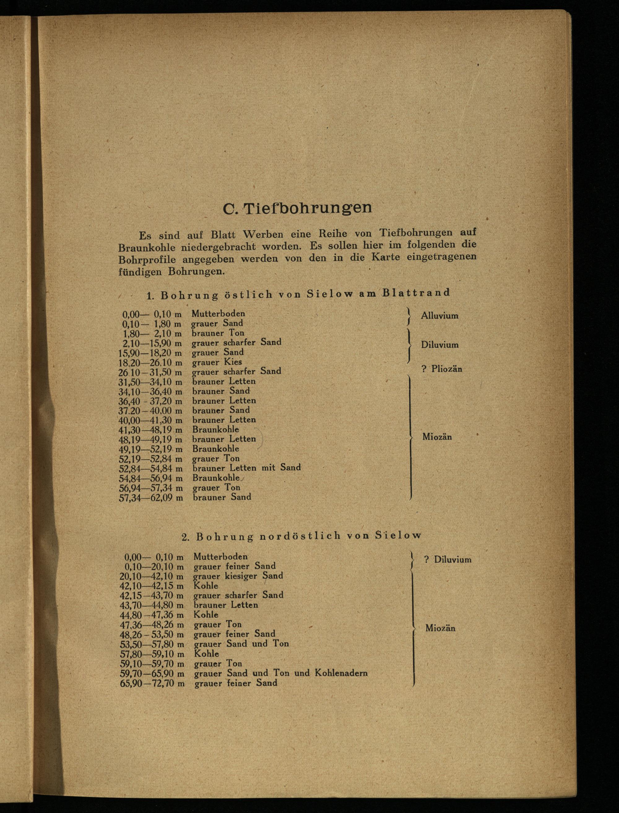 Es sind auf Blatt Werben eine Reihe von Tiefbohrungen auf Braunkohle niedergebracht worden. Es sollen hier im folgenden die Bohrprofile angegeben werden von den in die Karte eingetragenen fündigen Bohrungen. Ä