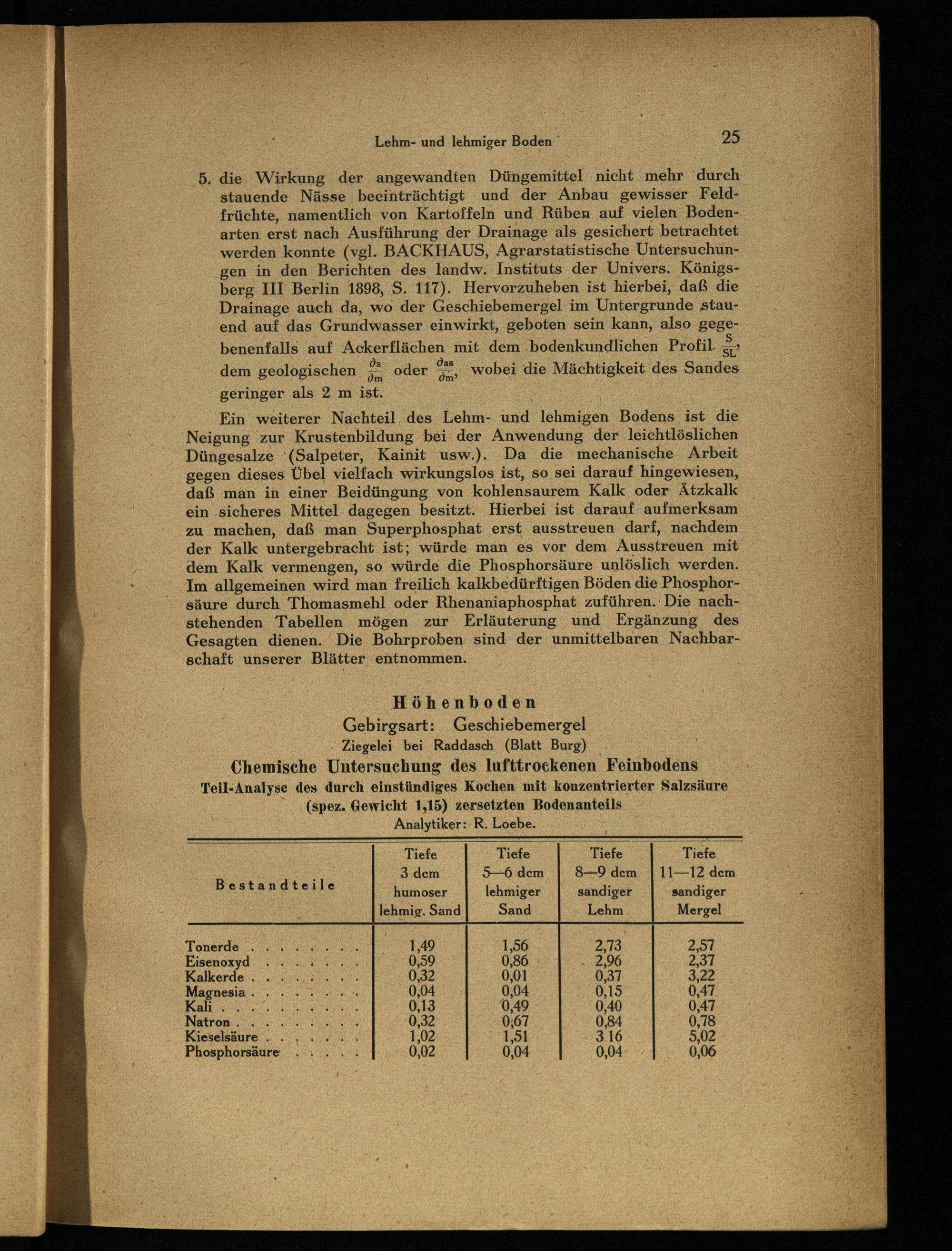 Höhenboden Gebirgsart: Geschiebemergel - Ziegelei bei Raddasch(Blatt Burg) Chemische Untersuchung des Ilufttrockenen Feinbodens Teil-Analyse des durch einstündiges Kochen mit konzentrierter Salzsäure ”(spez. Gewicht 1,15) zersetzten Bodenanteils Analytiker:-R. Loebe.
