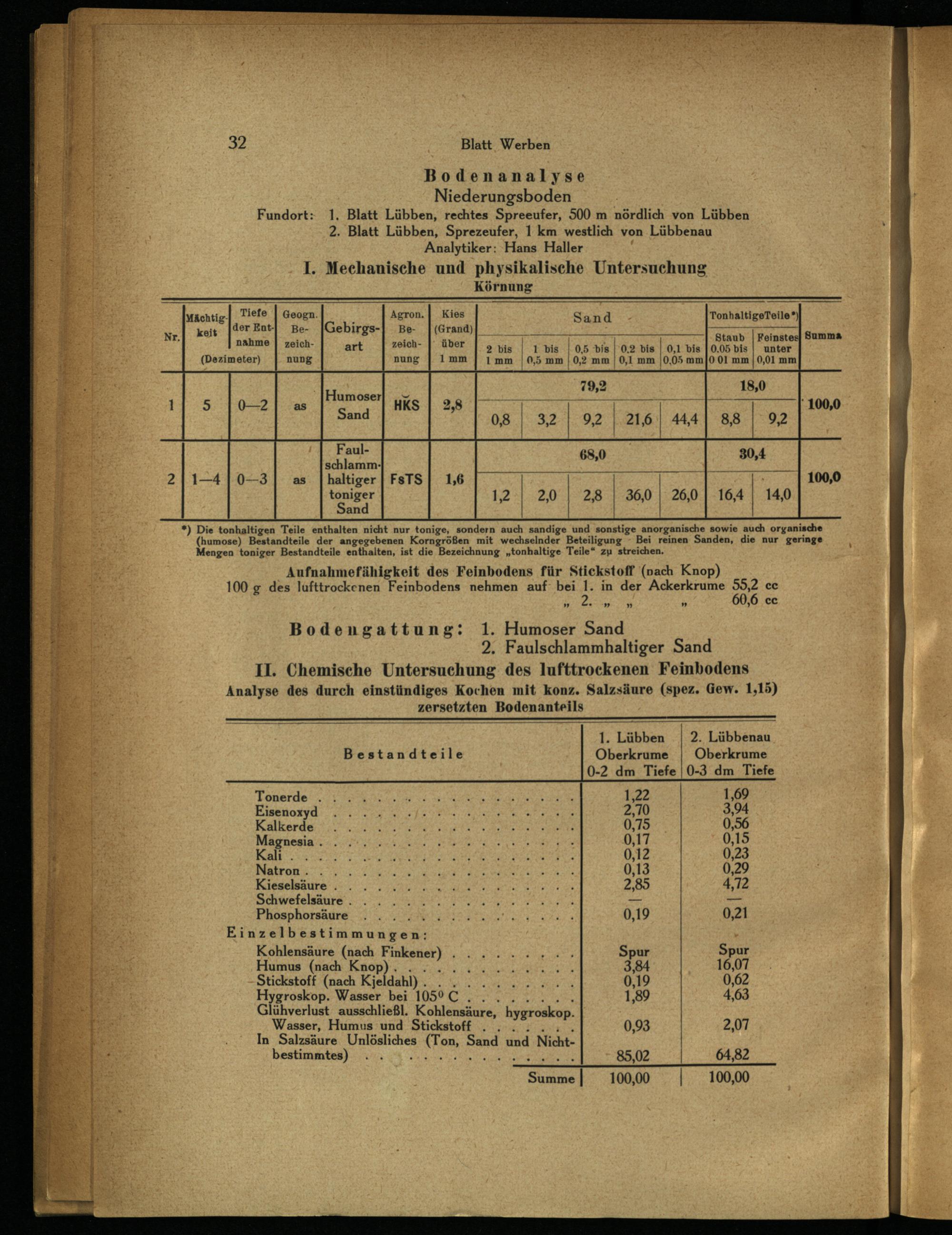 Bodenanalyse Niederungsboden; Fundort: 1, Blatt Lübben , rechtes Spreeufer, 500 m nördlich von Lübben 2. Blatt Lübben, Sprezeufer, 1 km westlich von Lübbenau Analytiker: Hans Haller