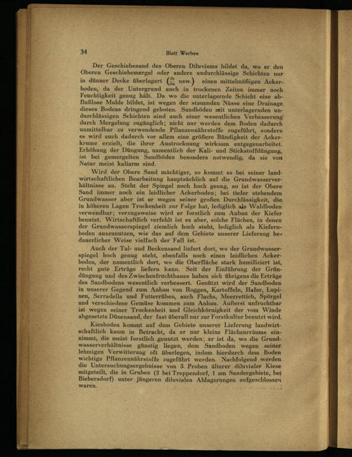 Wird der Obere Sand mächtiger, so kommt es bei seiner landwirtschaftlichen Bearbeitung hauptsächlich auf die Grundwasserverhältnisse an. Steht der Spiegel noch hoch genug, so ist der Obere Sand immer noch ein leidlicher Ackerboden; bei tiefer stehendem Grundwasser aber ist er wegen seiner großen Durchlässigkeit, die. in höheren Lagen Trockenheit zur Folge hat, lediglich als Waldboden’ verwendbar; vorzugsweise wird er forstlich zum Anbau der Kiefer benutzt. Wirtschaftlich verfehlt ist es aber, solche Flächen, in denen der Grundwasserspiegel ziemlich hoch steht, lediglich als Kiefernboden auszunutzen, wie das auf dem Gebiete unserer Lieferung bedauerlicher Weise vielfach der Fall ist.