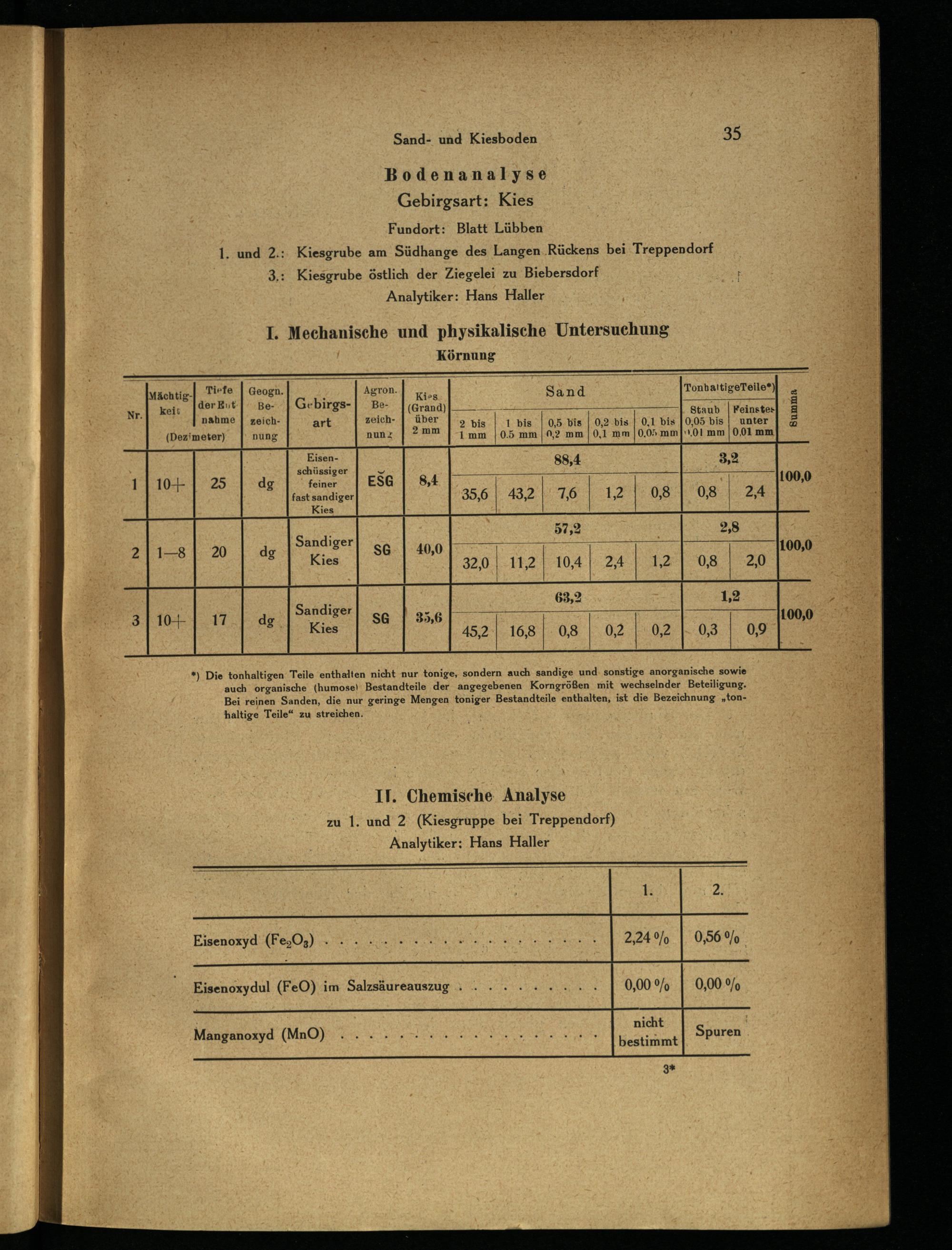 Il. Chemische. Analyse zu 1. und 2.(Kiesgruppe bei Treppendorf) Analytiker: Hans Haller