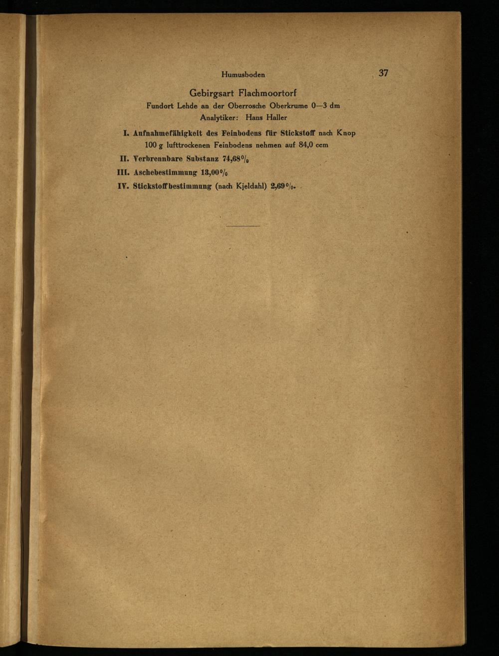 II. Verbrennbare Substanz 74,68%), III, Aschebestimmung 13,00% IV. Stickstoffbestimmung(nach Kjeldahl) 2,69%..