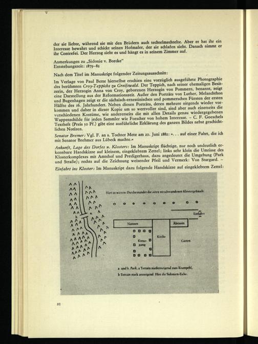 Ankunft, Lage des Dorfes u. Klosters: Im Manuskript flüchtige, nur noch undeutlich erkennbare Handskizze auf kleinem, eingeklebtem Zettel; links sehr klein die Umrisse des Klosterkomplexes mit Amtshof und Predigerhaus, dazu angedeutet die Umgebung (Park und Straße); rechts auf die Zeichnung weisender Pfeil und Vermerk: Von Stargard. -