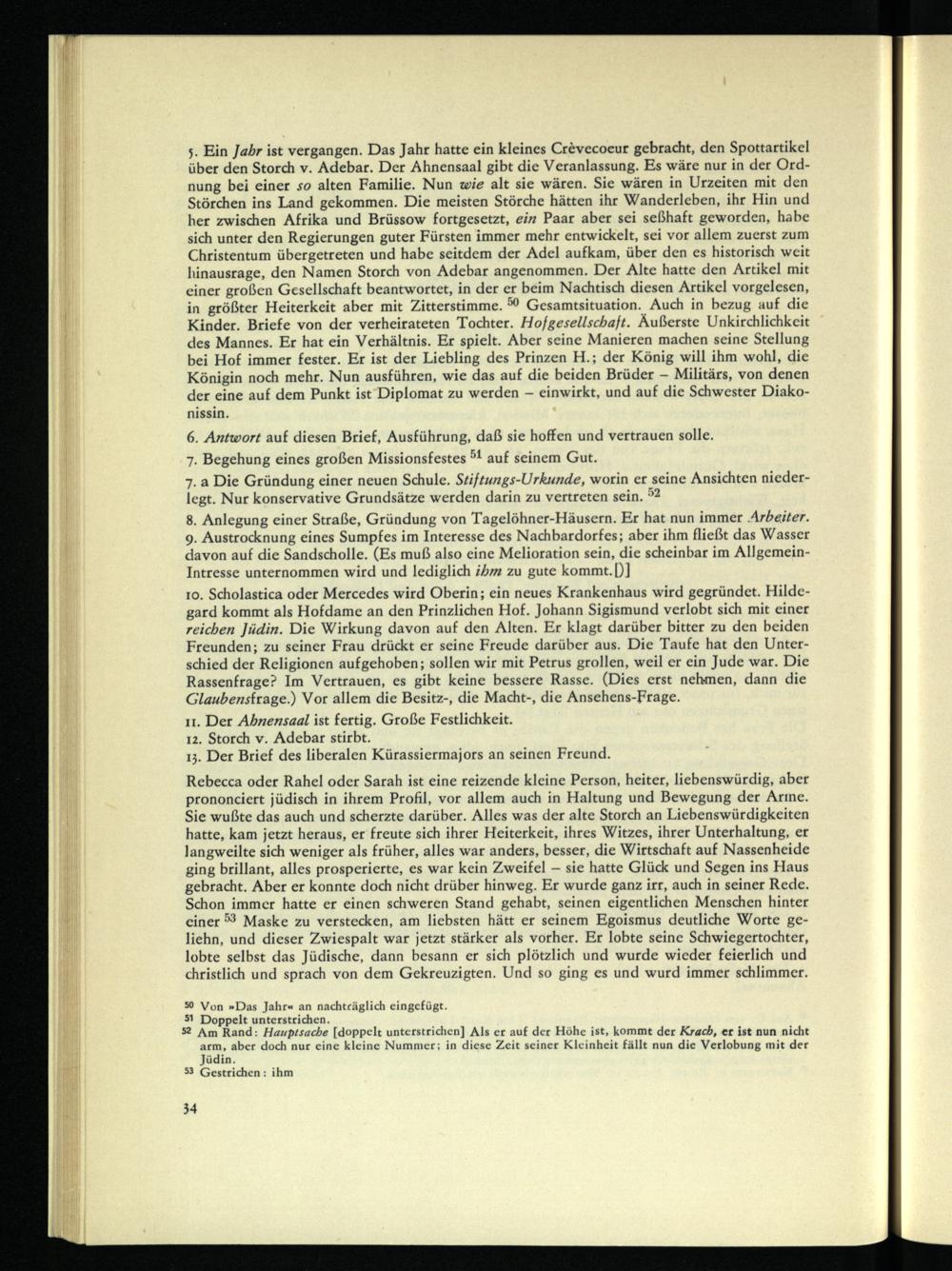 Rebecca oder Rahel oder Sarah ist eine reizende kleine Person, heiter, liebenswürdig, aber prononciert jüdisch in ihrem Profil, vor allem auch in Haltung und Bewegung der Arme. Sie wußte das auch und scherzte darüber. Alles was der alte Storch an Liebenswürdigkeiten hatte, kam jetzt heraus, er freute sich ihrer Heiterkeit, ihres Witzes, ihrer Unterhaltung, er langweilte sich weniger als früher, alles war anders, besser, die Wirtschaft auf Nassenheide ging brillant, alles prosperierte, es war kein Zweifel - sie hatte Glück und Segen ins Haus gebracht. Aber er konnte doch nicht drüber hinweg. Er wurde ganz irr, auch in seiner Rede. Schon immer hatte er einen schweren Stand gehabt, seinen eigentlichen Menschen hinter einer 53 Maske zu verstecken, am liebsten hätt er seinem Egoismus deutliche Worte ge- liehn, und dieser Zwiespalt war jetzt stärker als vorher. Er lobte seine Schwiegertochter, lobte selbst das Jüdische, dann besann er sich plötzlich und wurde wieder feierlich und christlich und sprach von dem Gekreuzigten. Und so ging es und wurd immer schlimmer.
