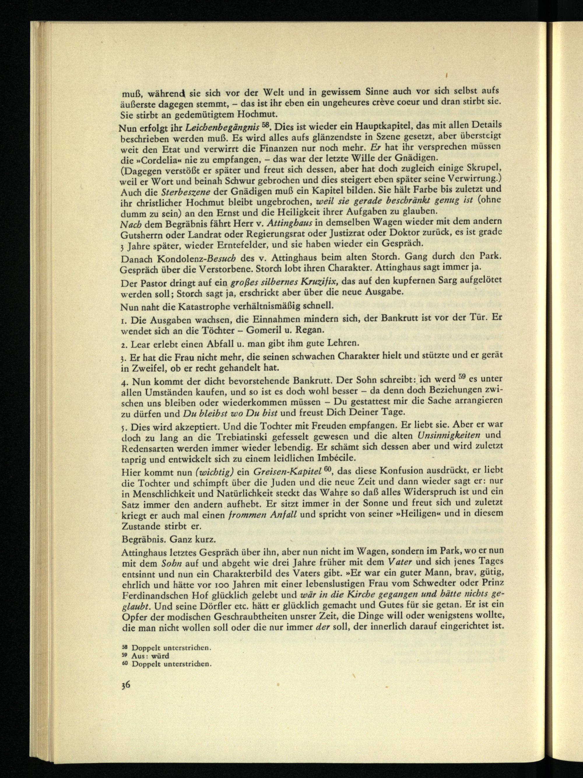 (Dagegen verstößt er später und freut sich dessen, aber hat doch zugleich einige Skrupel, weil er Wort und beinah Schwur gebrochen und dies steigert eben später seine Verwirrung.) Auch die Sterbeszene der Gnädigen muß ein Kapitel bilden. Sie hält Farbe bis zuletzt und ihr christlicher Hochmut bleibt ungebrochen, weil sie gerade beschränkt genug ist (ohne dumm zu sein) an den Ernst und die Heiligkeit ihrer Aufgaben zu glauben.