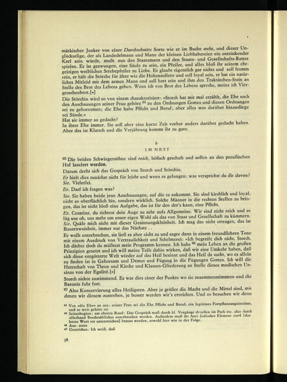 Er wollt unterbrechen, sie ließ es aber nicht zu und sagte dann in einem freundlichem Tone mit einem Ausdruck von Vertraulichkeit und Schelmerei: »Ich begreife dich nicht, Storch. Ich dächte doch du müßtest mein Programm kennen. Ich habe fiB mein Leben an die großen Prinzipien gesetzt und ich will meins Teils dahin wirken, daß wir eine Umkehr haben, daß sich diese entgötterte Welt wieder auf das Heil besinnt und das Heil da sucht, wo es allein zu finden ist in Gehorsam und Demut und Fügung in die Fügungen Gottes. Ich will die Herrschaft von Thron und Kirche und Klassen-Gliederung an Stelle dieses modischen Unsinns von der Egalite.[«]