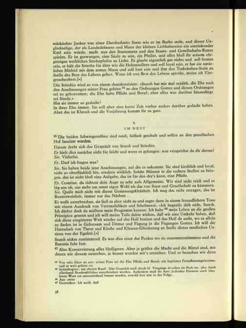 Die Störchin wird so von einem charakterisiert: »Storch hat mir mal erzählt, die Ehe nach den Anschauungen seiner Frau gehöre w zu den Ordnungen Gottes und diesen Ordnungen sei zu gehorsamen; die Ehe habe Pflicht und Beruf; aber alles was darüber hinausliege sei Sünde.»