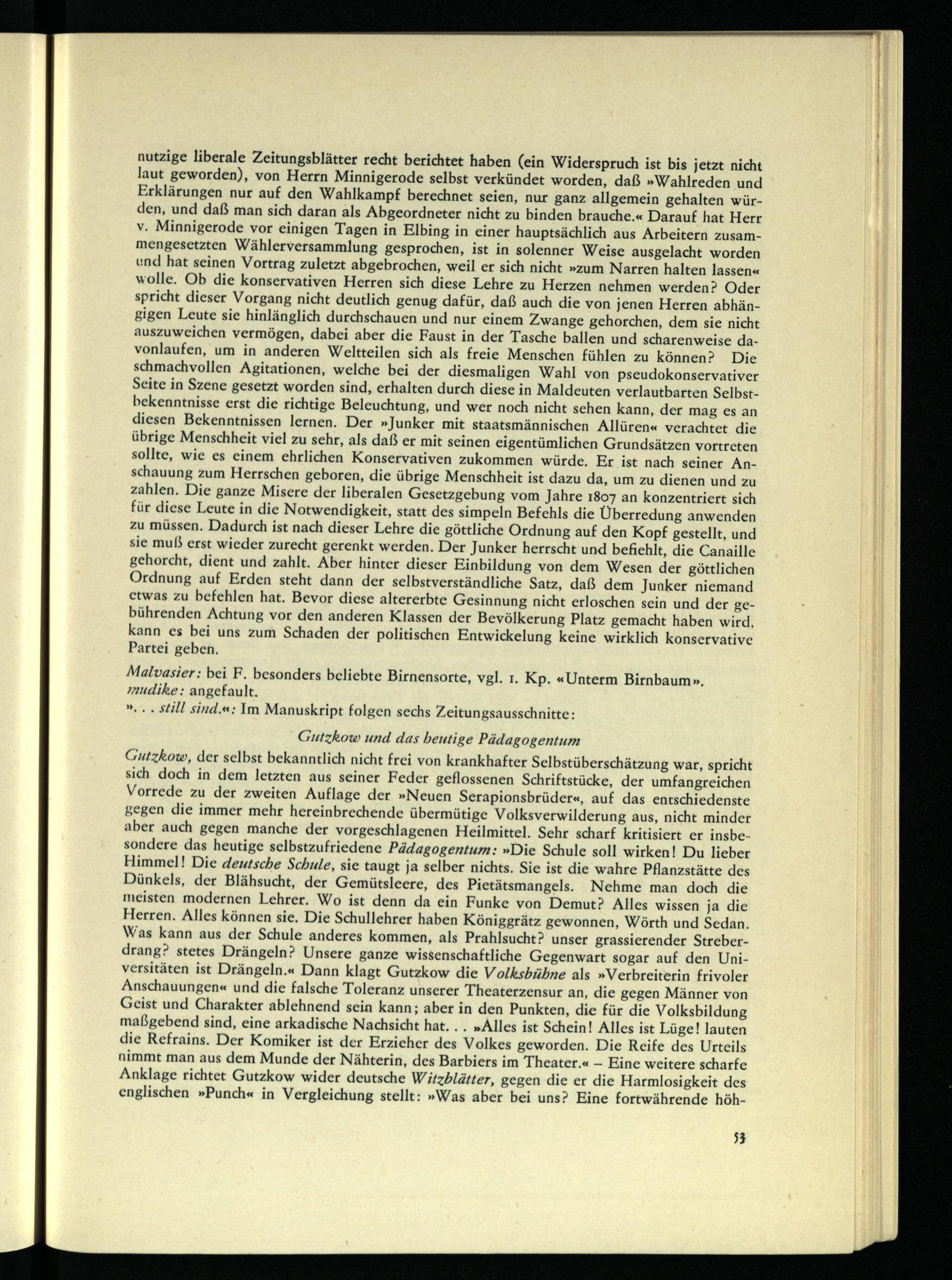 Gutzkow, der selbst bekanntlich nicht frei von krankhafter Selbstüberschätzung war, spricht sich doch in dem letzten aus seiner Feder geflossenen Schriftstücke, der umfangreichen Vorrede zu der zweiten Auflage der »Neuen Serapionsbrüder«, auf das entschiedenste gegen die immer mehr hereinbrechende übermütige Volksverwilderung aus, nicht minder aber auch gegen manche der vorgeschlagenen Heilmittel. Sehr scharf kritisiert er insbesondere das heutige selbstzufriedene Pädagogentum: »Die Schule soll wirkenI Du lieber Himmel! Die deutsche Schule, sie taugt ja selber nichts. Sie ist die wahre Pflanzstätte des Dünkels, der Blähsucht, der Gemütsleere, des Pietätsmangels. Nehme man doch die meisten modernen Lehrer. Wo ist denn da ein Funke von Demut? Alles wissen ja die Herren. Alles können sie. Die Schullehrer haben Königgrätz gewonnen, Wörth und Sedan. Was kann aus der Schule anderes kommen, als Prahlsucht? unser grassierender Streberdrang? stetes Drängeln? Unsere ganze wissenschaftliche Gegenwart sogar auf den Universitäten ist Drängeln.« Dann klagt Gutzkow die Volksbühne als »Verbreiterin frivoler Anschauungen« und die falsche Toleranz unserer Theaterzensur an, die gegen Männer von Geist und Charakter ablehnend sein kann; aber in den Punkten, die für die Volksbildung maßgebend sind, eine arkadische Nachsicht hat. . . »Alles ist Schein 1 Alles ist Lüge! lauten die Refrains. Der Komiker ist der Erzieher des Volkes geworden. Die Reife des Urteils nimmt man aus dem Munde der Nähterin, des Barbiers im Theater.« - Eine weitere scharfe Anklage richtet Gutzkow wider deutsche Witzblätter, gegen die er die Harmlosigkeit des englischen »Punch« in Vergleichung stellt: »Was aber bei uns? Eine fortwährende höh-