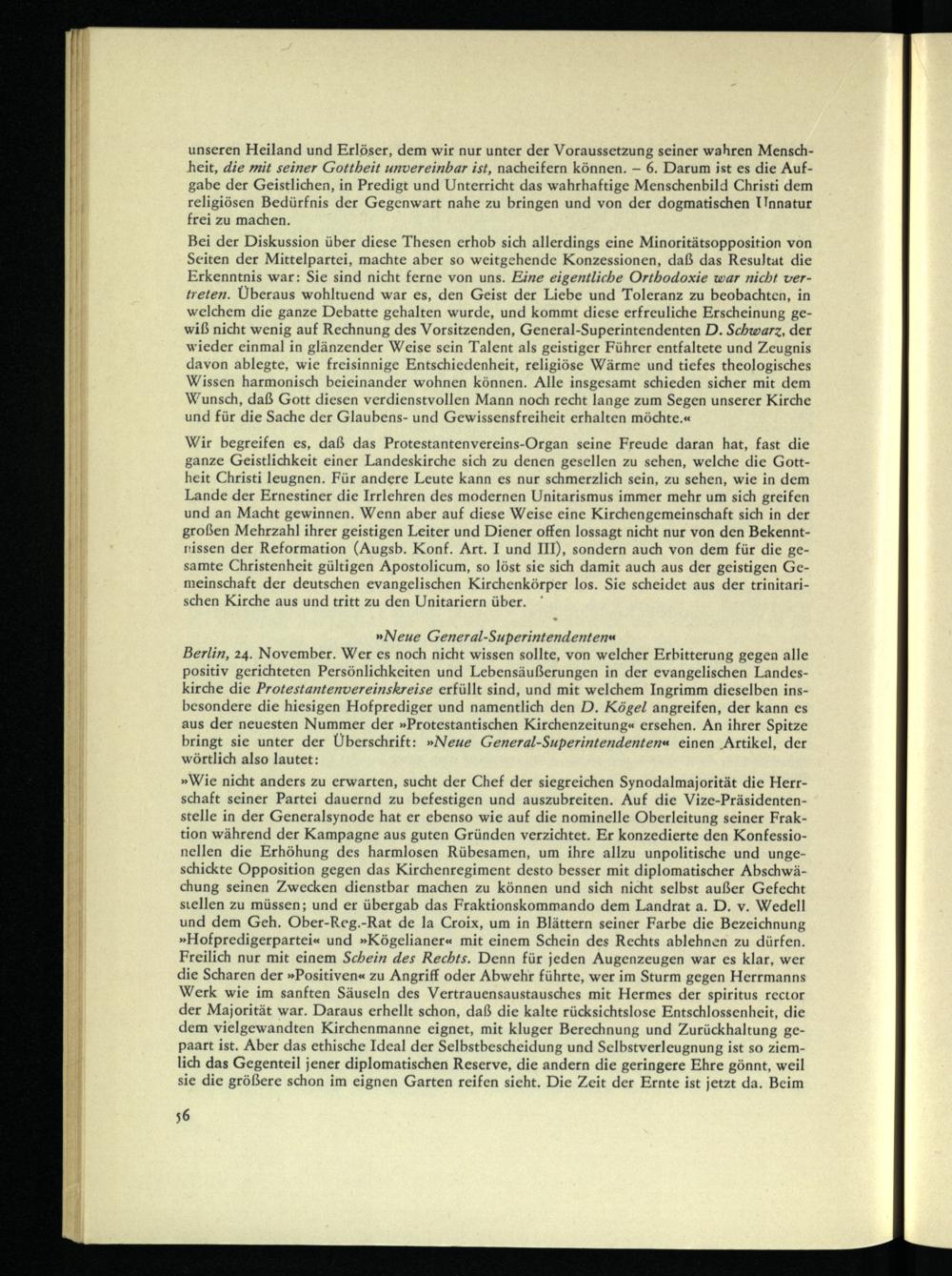 Bei der Diskussion über diese Thesen erhob sich allerdings eine Minoritätsopposition von Seiten der Mittelpartei, machte aber so weitgehende Konzessionen, daß das Resultat die Erkenntnis war: Sie sind nicht ferne von uns. Eine eigentliche Orthodoxie war nicht vertreten. Überaus wohltuend war es, den Geist der Liebe und Toleranz zu beobachten, in welchem die ganze Debatte gehalten wurde, und kommt diese erfreuliche Erscheinung gewiß nicht wenig auf Rechnung des Vorsitzenden, General-Superintendenten D. Schwarz, der wieder einmal in glänzender Weise sein Talent als geistiger Führer entfaltete und Zeugnis davon ablegte, wie freisinnige Entschiedenheit, religiöse Wärme und tiefes theologisches Wissen harmonisch beieinander wohnen können. Alle insgesamt schieden sicher mit dem Wunsch, daß Gott diesen verdienstvollen Mann noch recht lange zum Segen unserer Kirche und für die Sache der Glaubens- und Gewissensfreiheit erhalten möchte.«