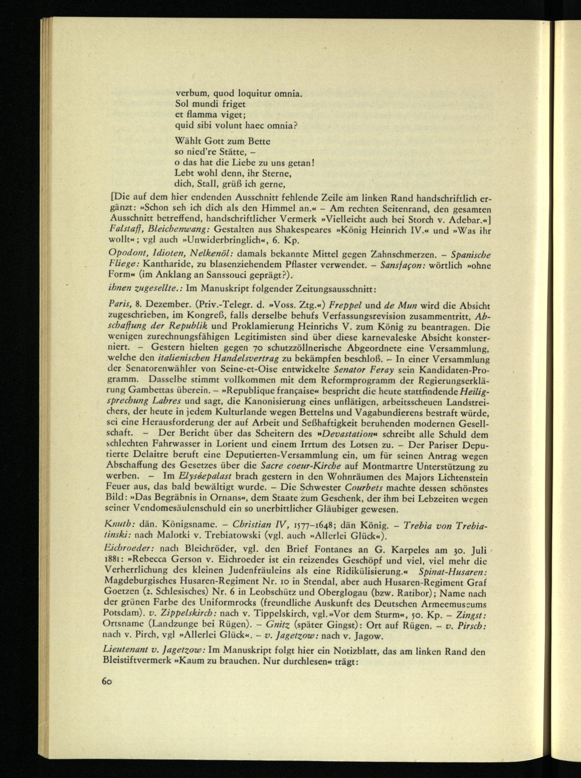 Opodont, Idioten, Nelkenöl: damals bekannte Mittel gegen Zahnschmerzen. - Spanische Fliege: Kantharide, zu blasenziehendem Pflaster verwendet. - Sansjafon: wörtlich »ohne Form« (im Anklang an Sanssouci geprägt?). ihnen zugesellte.: Im Manuskript folgender Zeitungsausschnitt: