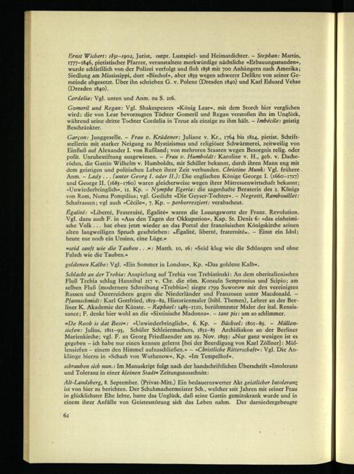 Garfon: Junggeselle. - Frau v. Krüdener: Juliane v. Kr., 1764 bis 1824, pietist. Schriftstellerin mit starker Neigung zu Mystizismus und religiöser Schwärmerei, zeitweilig von Einfluß auf Alexander I. von Rußland; von mehreren Staaten wegen Besorgnis relig. oder polit. Unruhestiftung ausgewiesen. - Frau v. Humboldt: Karoline v. H., geb. v. Dache- röden, die Gattin Wilhelm v. Humboldts, mit Schiller bekannt, durch ihren Mann eng mit dem geistigen und politischen Leben ihrer Zeit verbunden. Christine Munk: Vgl. frühere Anm. - Lady.. . (unter Georg I. oder II.): Die englischen Könige George I. (1660-1727) und George II. (1683-1760) waren gleicherweise wegen ihrer Mätressenwirtschaft bekannt; »Unwiederbringlich«, 12. Kp. - Nymphe Egeria: die sagenhafte Beraterin des 2. Königs von Rom, Numa Pompilius; vgl. Gedicht »Die Geyser-Tochter«. - Negretti, Rambouillet: Schafrassen; vgl auch »Cecile«, 7. Kp. - perhorresziert: verabscheut.