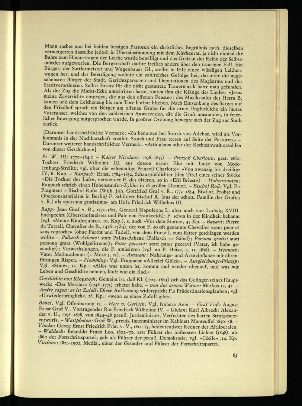 Fr. W. III: 4770-184.0 - Kaiser Nicolaus: 1796-1855). - Prinzeß Charlotte: gest. 1860, Tochter Friedrich Wilhelms III. aus dessen erster Ehe mit Luise von Meck- lenburg-Strelitz; vgl. über die »ehemalige Prinzeß Charlotte« »Von zwanzig bis dreißig« IV, 6. Kap. — Raupach: Ernst, 1784-1852, Schauspieldichter (den Titel eines seiner Stücke »Die Tochter der Luft«, verwendet F. des öfteren, so in »Effi Briest«). - Hohenstaufen: Raupach schrieb einen Hohenstaufen-Zyklus in 16 großen Dramen. - Bischof Roß: Vgl. F.s Fragment » Bischof Roß« (Wilh. Joh. Gottfried Graf v. R., 1772-1854, Bischof, Probst und Oberkonsistorialrat in Berlin) F. Schildert Bischof R. (aus der schott. Familie der Grafen v. R.) als »persona gratissima« am Hofe Friedrich Wilhelms III.