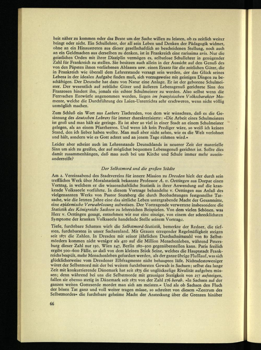Leider aber scheint auch im Lehrerstande Deutschlands in neuerer Zeit der materielle Sinn um sich zu greifen, der auf möglichst bequemen Lebensgenuß gerichtet ist. Sollte dies damit Zusammenhängen, daß man auch bei uns Kirche und Schule immer mehr auseinanderreißt?