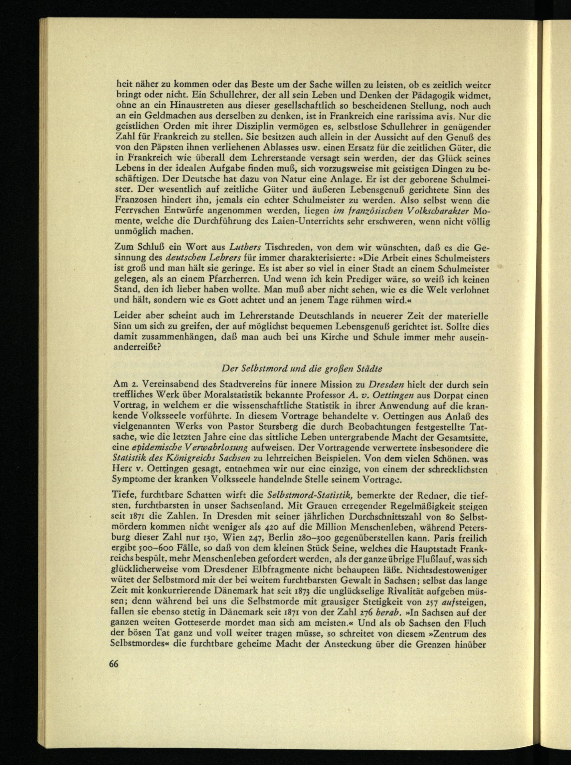 Am z. Vereinsabend des Stadtvereins für innere Mission zu Dresden hielt der durch sein treffliches Werk über Moralstatistik bekannte Professor A. v. Oellingen aus Dorpat einen Vortrag, in welchem er die wissenschaftliche Statistik in ihrer Anwendung auf die krankende Volksseele vorführte. In diesem Vortrage behandelte v. Oettingen aus Anlaß des vielgenannten Werks von Pastor Stursberg die durch Beobachtungen festgestellte Tatsache, wie die letzten Jahre eine das sittliche Leben untergrabende Macht der Gesamtsitte, eine epidemische Verwahrlosung aufweisen. Der Vortragende verwertete insbesondere die Statistik des Königreichs Sachsen zu lehrreichen Beispielen. Von dem vielen Schönen, was Herr v. Oettingen gesagt, entnehmen wir nur eine einzige, von einem der schrecklichsten Symptome der kranken Volksseele handelnde Stelle seinem Vortrage.