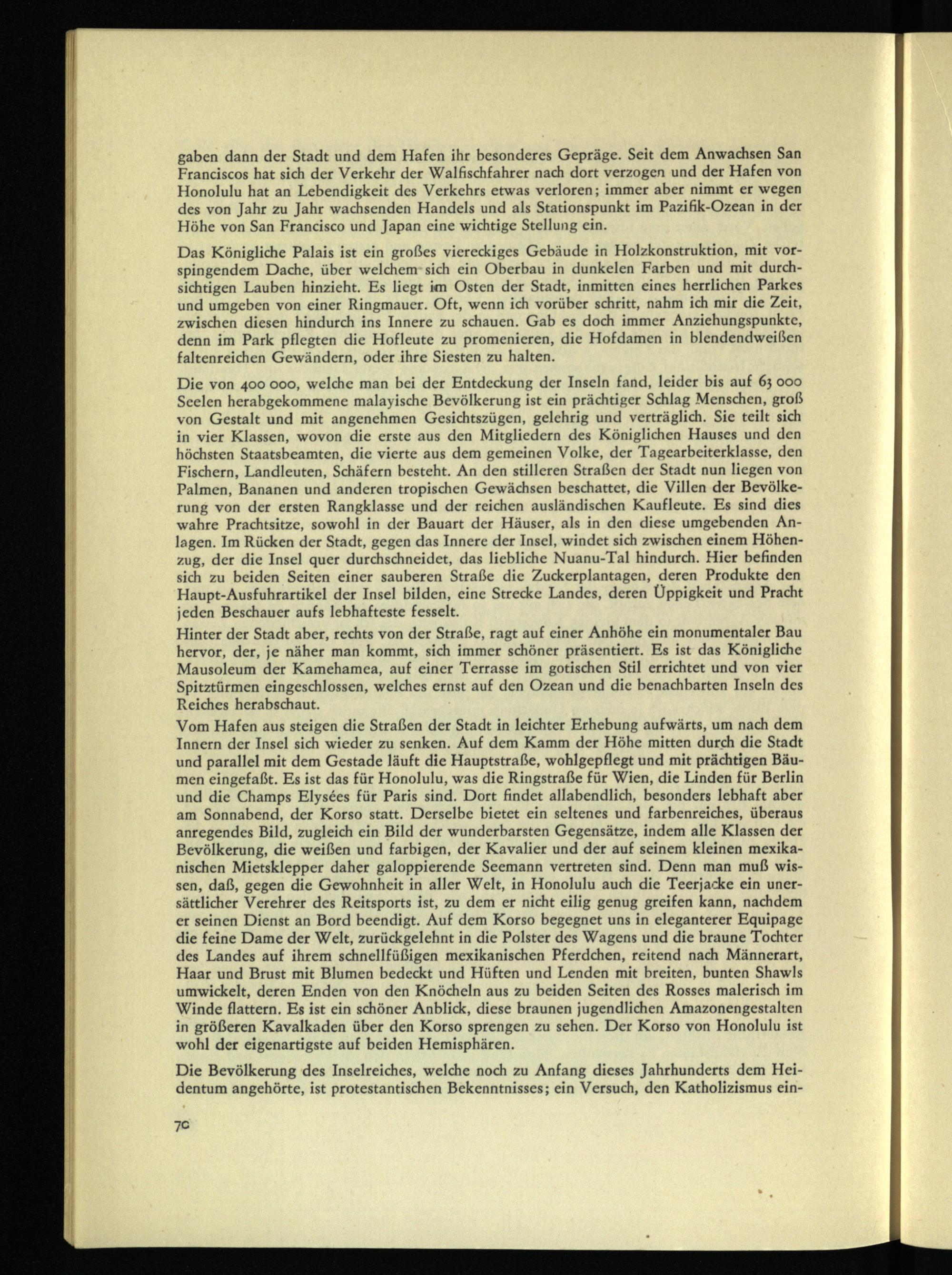 Die von 400 000, welche man bei der Entdeckung der Inseln fand, leider bis auf 63 000 Seelen herabgekommene malayischc Bevölkerung ist ein prächtiger Schlag Menschen, groß von Gestalt und mit angenehmen Gesichtszügen, gelehrig und verträglich. Sie teilt sich in vier Klassen, wovon die erste aus den Mitgliedern des Königlichen Hauses und den höchsten Staatsbeamten, die vierte aus dem gemeinen Volke, der Tagearbeiterklasse, den Fischern, Landleuten, Schäfern besteht. An den stilleren Straßen der Stadt nun liegen von Palmen, Bananen und anderen tropischen Gewächsen beschattet, die Villen der Bevölkerung von der ersten Rangklasse und der reichen ausländischen Kaufleute. Es sind dies wahre Prachtsitze, sowohl in der Bauart der Häuser, als in den diese umgebenden Anlagen. Im Rücken der Stadt, gegen das Innere der Insel, windet sich zwischen einem Höhenzug, der die Insel quer durchschneidet, das liebliche Nuanu-Tal hindurch. Hier befinden sich zu beiden Seiten einer sauberen Straße die Zuckerplantagen, deren Produkte den Haupt-Ausfuhrartikel der Insel bilden, eine Strecke Landes, deren Üppigkeit und Pracht jeden Beschauer aufs lebhafteste fesselt.